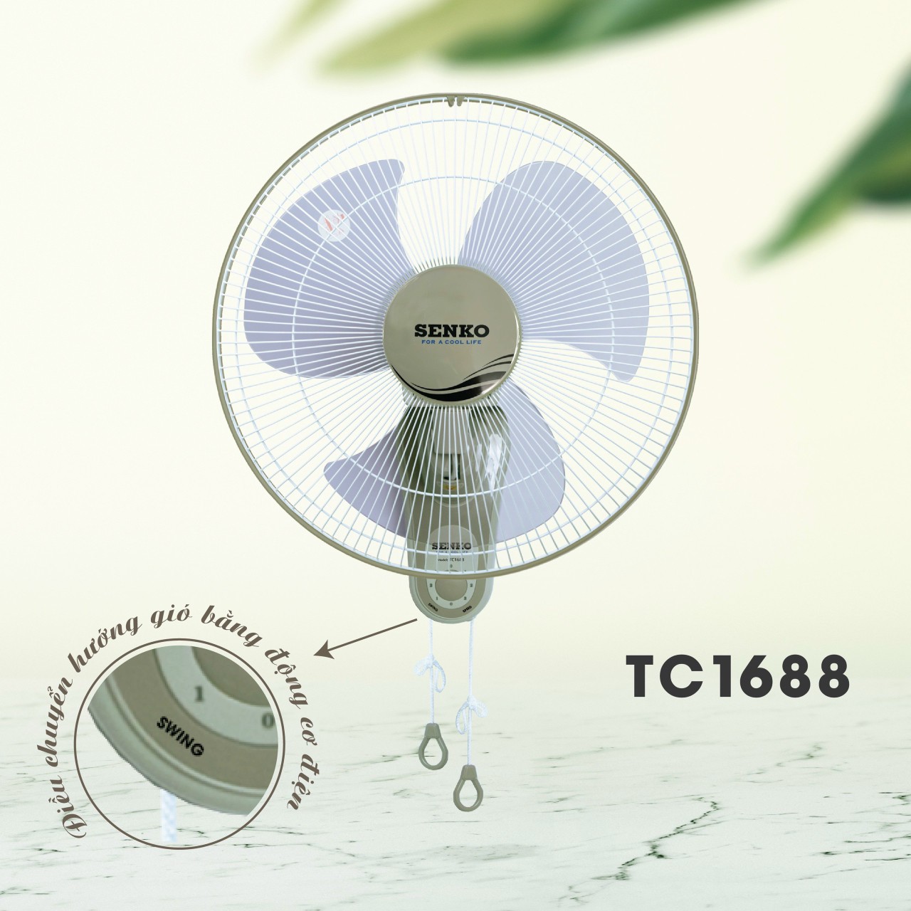 Quạt treo 2 dây SENKO TC1626 Công suất 47W 3 tốc độ gió điều chỉnh bằng dây kéo Đường kính cánh: 40cm Loại motor: Bạc thau Thiết kế treo tường tiết kiệm không gian -