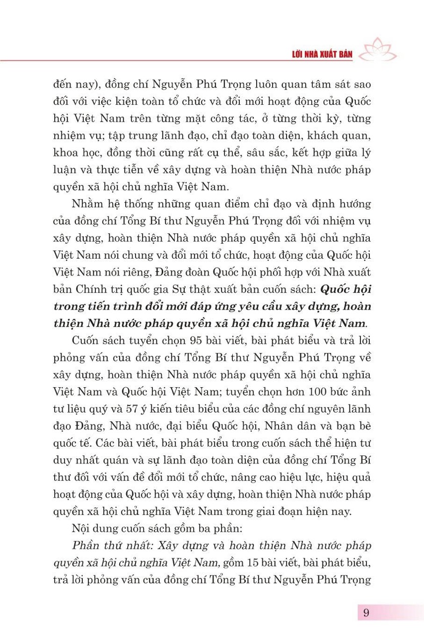Cuốn sách tuyển chọn 95 bài viết, bài phát biểu và trả lời phỏng vấn của đồng chí Tổng Bí thư Nguyễn Phú Trọng về xây dựng, hoàn thiện Nhà nước pháp quyền xã hội chủ nghĩa Việt Nam và Quốc hội Việt Nam; tuyển chọn hơn 100 bức ảnh tư liệu quý và 57 ý kiến tiêu biểu của các đồng chí nguyên lãnh đạo Đảng, Nhà nước, đại biểu Quốc hội, Nhân dân và bạn bè quốc tế. Các bài viết, bài phát biểu trong cuốn sách thể hiện tư duy nhất quán và sự lãnh đạo toàn diện của đồng chí Tổng Bí thư đối với vấn đề đổi mới tổ chức, nâng cao hiệu lực, hiệu quả hoạt động của Quốc hội và xây dựng, hoàn thiện Nhà nước pháp quyền xã hội chủ nghĩa Việt Nam trong giai đoạn hiện nay.