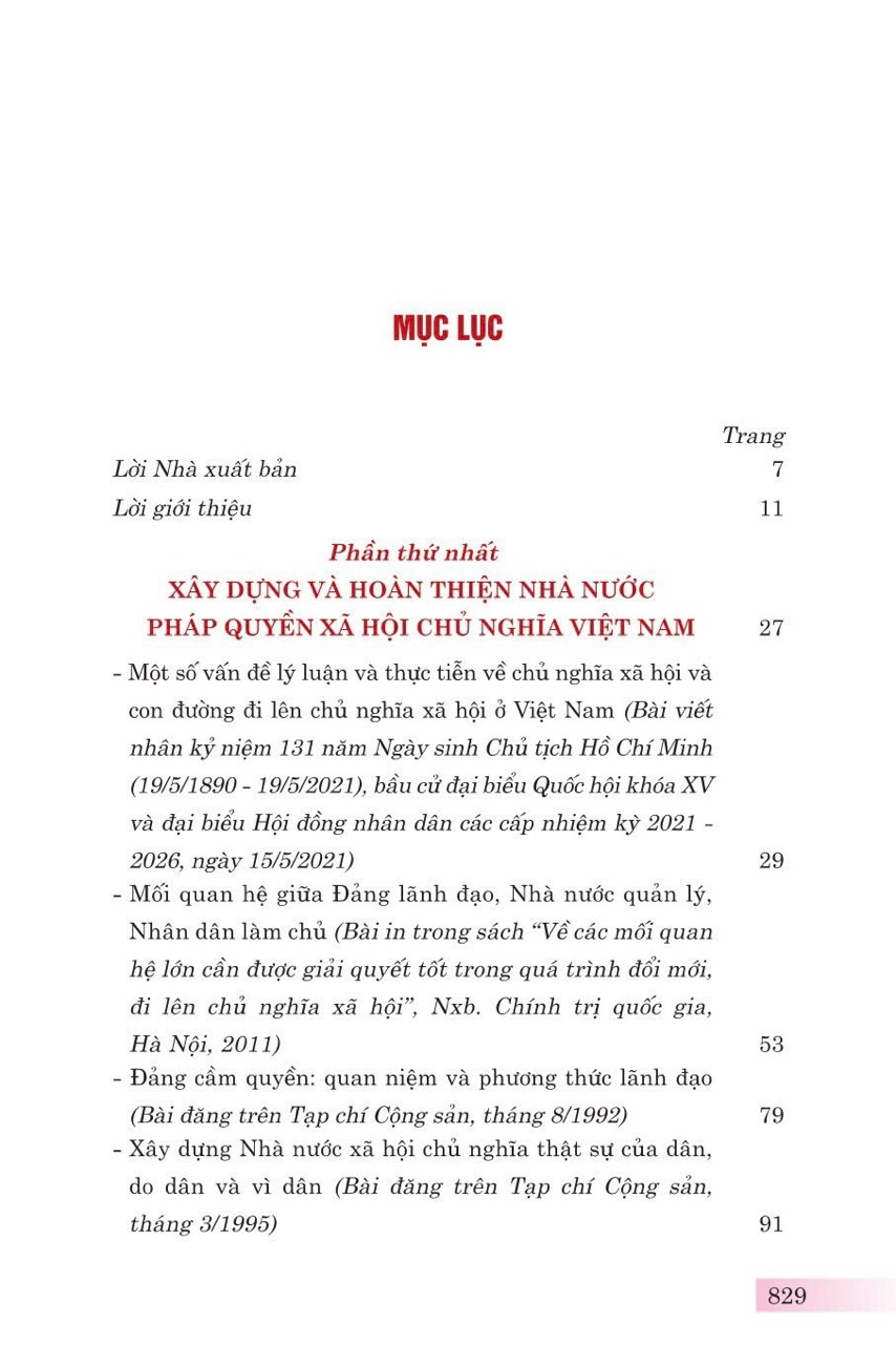 Phần thứ nhất: Xây dựng và hoàn thiện Nhà nước pháp quyền xã hội chủ nghĩa Việt Nam, gồm 15 bài viết, bài phát biểu, trả lời phỏng vấn của đồng chí Tổng Bí thư Nguyễn Phú Trọng về các vấn đề: chủ nghĩa xã hội và con đường đi lên chủ nghĩa xã hội; xây dựng, hoàn thiện Nhà nước pháp quyền xã hội chủ nghĩa và các thiết chế trong Nhà nước pháp quyền xã hội chủ nghĩa Việt Nam.
