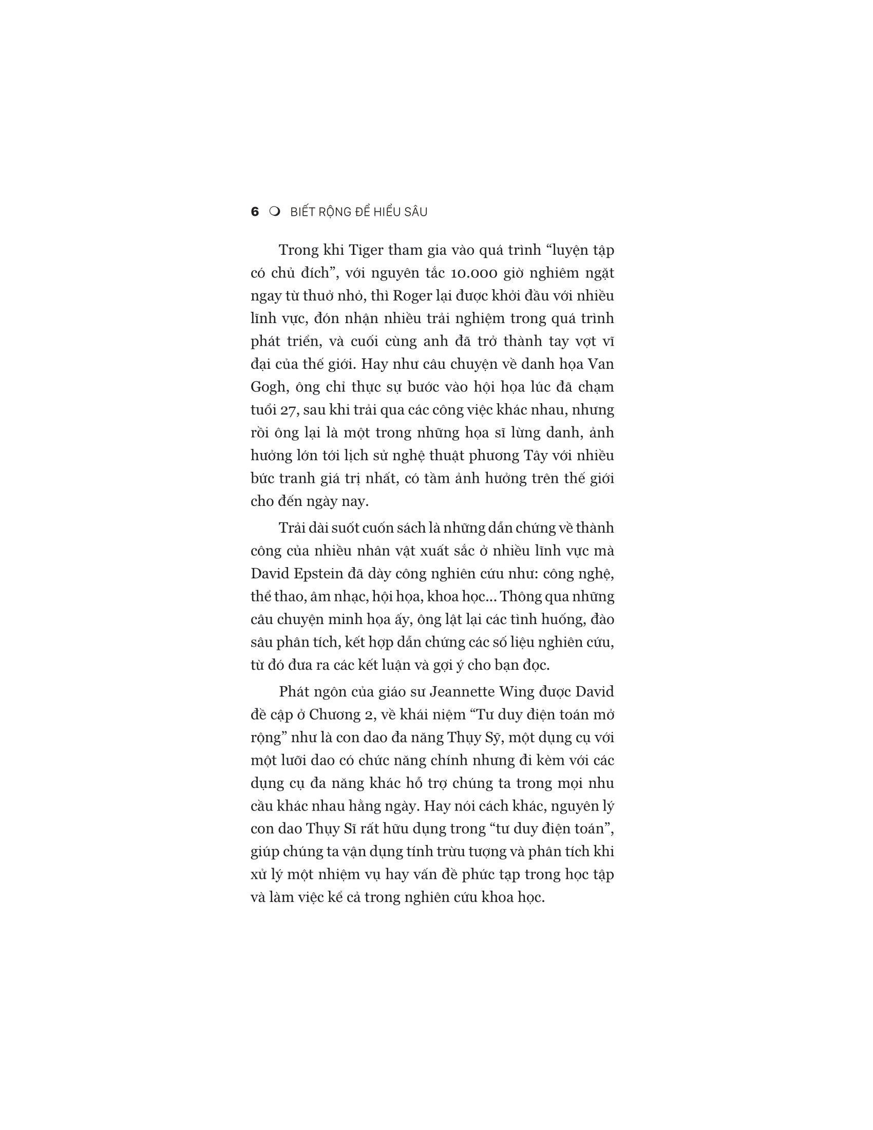 David Epstein đã kiểm tra các vận động viên, nghệ sĩ, nhạc sĩ, nhà phát minh, nhà dự báo và nhà khoa học thành công nhất thế giới. Ông phát hiện ra rằng trong hầu hết các lĩnh vực – đặc biệt là những lĩnh vực phức tạp và khó đoán – những người có tư duy tổng quát (chứ không phải chuyên gia) đều có tố chất xuất sắc. Những người theo chủ nghĩa tổng quát thường tìm ra con đường của m.ình muộn và họ có nhiều mối quan tâm hơn là tập trung vào một. Họ cũng sáng tạo hơn, nhanh nhẹn hơn và có thể tạo ra những kết nối mà những đồng nghiệp chuyên môn hóa không thể nhìn thấy.