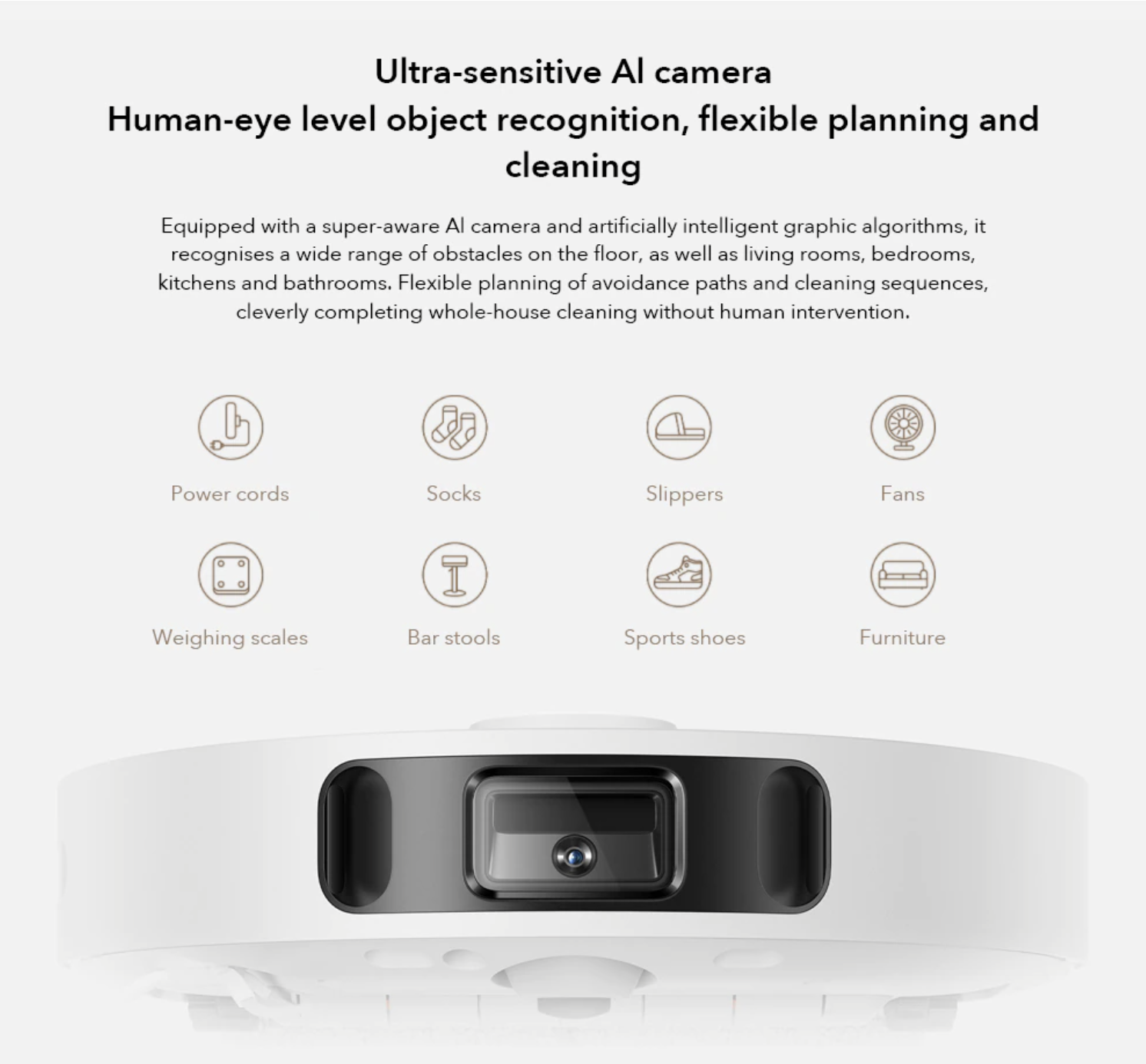 Để quá trình hút và lau diễn ra trơn tru, Máy hút bụi tích hợp camera hỗ trợ hệ thống tránh chướng ngại vật nhận dạng ba chiều S-cross AI . Đối với hệ thống này thuật toán AI có thể cho biết độ chính xác nhận biết ở cấp độ mét. Xác định các chướng ngại vật khác nhau và tránh chướng ngại vật một cách nhanh chóng, chính xác và ổn định.