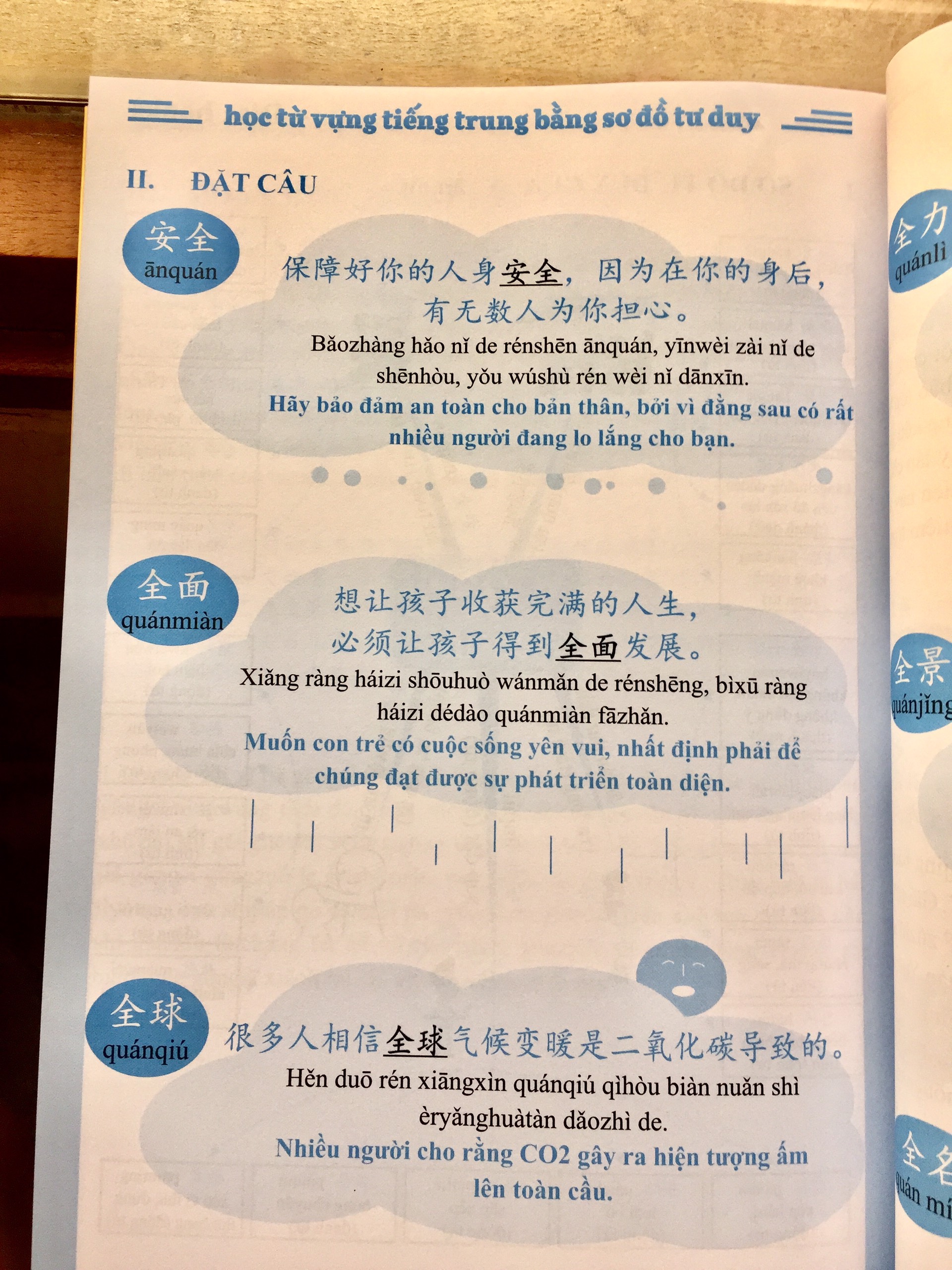 2. Giới thiệu sách: Học từ vựng tiếng Trung bằng sơ đồ tư duy Nội dung sách: Cuốn sách mang sứ mệnh giúp người học sau khi đã làm quen với chữ Hán, có thể nhanh chóng tiếp cận với ngồn từ ghép của các chữ Hán Tác giả: Diệu Hồ Số trang: 308 Năm xuất bản: 2019 Nhà xuất Bản: Đà Nẵng Giá bìa: 300000 VNĐ 1.Như chúng ta biết, não chúng ta chia thành hai phần: bán cầu trái và bán cầu phải. Bán cầu trái được dùng để sử lý các tính toán và logic, trong khi bán cầu phải lại là nơi ghi nhớ các hình ảnh. Thường thì người ngành công nghệ hoặc kinh tế dùng bán cầu trái nhiều hơn trong khi quên mất tầm quan trọng của bán cầu phải. Tuy nhiên, theo nghiên cứu của nhiều nhà khoa học (trong đó có Tony Buzan, người thành công nhất trong việc đưa ra lý thuyết và áp dụng kỹ thuật Mind Mapping, và người viết sách thành công nhất trong lĩnh vực này) thì nếu làm cách nào đó phối hợp cả hai bán cầu này cùng làm việc để sử lý một vấn đề thì sẽ được hiệu quả cao hơn so với chỉ dùng một. Sơ đồ tư duy là kỹ thuật sử lý một công việc nào đó bằng cách kích cả hai bán cầu cùng hoạt động, mà cụ thể là việc vẽ ra những sơ đồ tư duy.