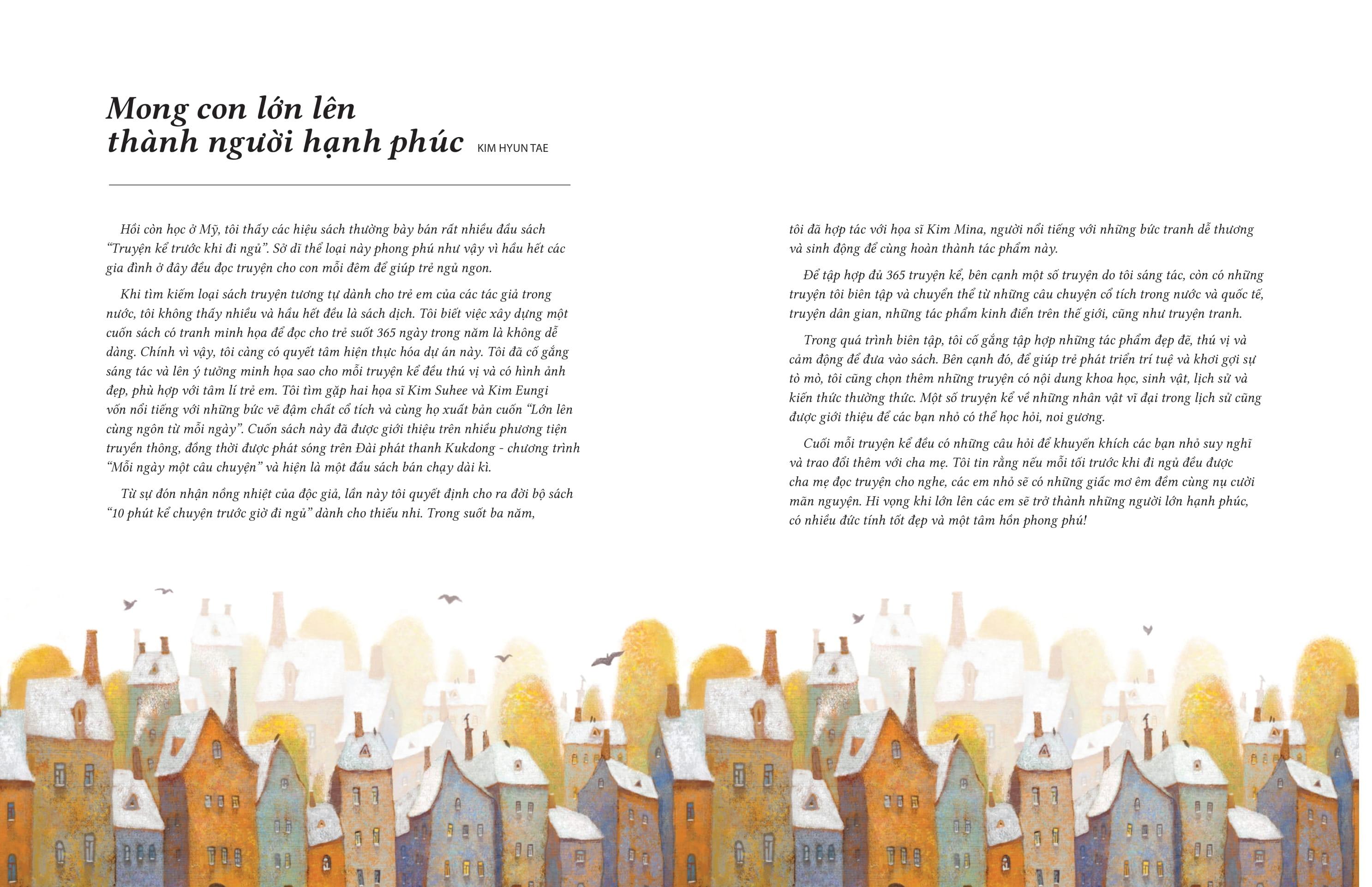 Bộ sách này gồm 2 tập, tập hợp 365 truyện kể lấy cảm hứng từ nhiều chủ đề, câu chuyện và các nền văn hóa trên khắp thế giới, có thể đọc liên tục trong suốt một năm. Mỗi câu chuyện lại gửi gắm những bài học ý nghĩa khác nhau để cha mẹ và các em nhỏ cùng khám phá.