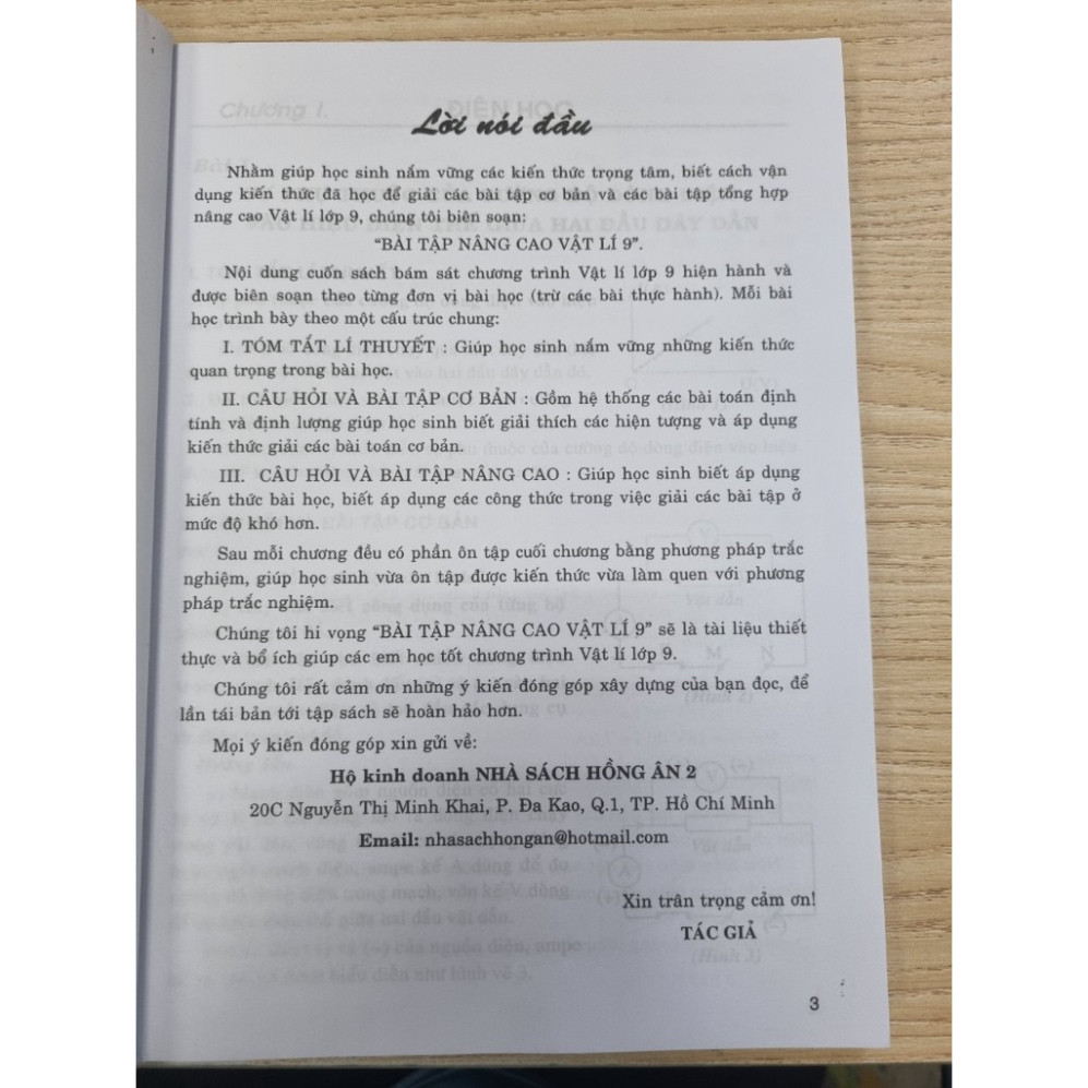 Sách - bài tập nâng cao vật lí 9 bồi dưỡng học sinh giỏi (dùng chung cho các bộ sgk hiện hành) + ha    Nhằm giúp học sinh nắm vững các kiến thức trọng tâm, biết cách vận dụng kiến thức đã học để giải các bài tập cơ bản và các bài tập tổng hợp nâng cao Vật lí lớp 9, chúng tôi biên soạn: “BÀI TẬP NÂNG CAO VẬT LÍ 9”. Nội dung cuốn sách bám sát chương trình Vật lí lớp 9 hiện hành và được biên soạn theo từng đơn vị bài học (trừ các bài thực hành). Mỗi bài học trình bày theo một cấu trúc chung: I. TÓM TẮT LÍ THUYẾT : Giúp học sinh nắm vững những kiến thức quan trọng trong bài học. II. CÂU HỎI VÀ BÀI TẬP CƠ BẢN : Gồm hệ thống các bài toán định tính và định lượng giúp học sinh biết giải thích các hiện tượng và áp dụng kiến thức giải các bài toán cơ bản. III. CÂU HỎI VÀ BÀI TẬP NÂNG CAO : Giúp học sinh biết áp dụng kiến thức bài học, biết áp dụng các công thức trong việc giải các bài tập ở mức độ khó hơn. Sau mỗi chương đều có phần ôn tập cuối chương bằng phương pháp trắc nghiệm, giúp học sinh vừa ôn tập được kiến thức vừa làm quen với phương pháp trắc nghiệm. Chúng tôi hi vọng “BÀI TẬP NÂNG CAO VẬT LÍ 9” sẽ là tài liệu thiết thực và bổ ích giúp các em học tốt chương trình Vật lí lớp 9. Chúng tôi rất cảm ơn những ý kiến đóng góp xây dựng của bạn đọc, để lần tái bản tới tập sách sẽ hoàn hảo hơn.   Nhà xuất bản: Nhà Xuất Bản Đại Học Quốc Gia Hà Nội Nhà phát hành: Nhà Sách Hồng Ân Tác giả: TS. NGUYỄN THANH HẢI Năm xuất bản: 2024 Số trang: 199