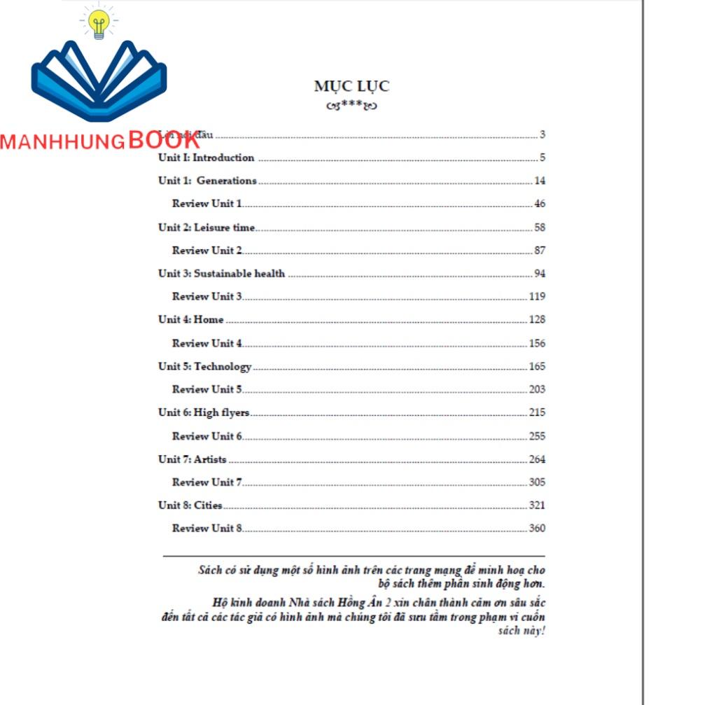Bài tập Tiếng Anh 11 – Không đáp án gồm một bài ôn tập củng cố kiến thức đã học (Introduction), và 8 đơn vị bài học chính: Generations, Leisure time, Sustainable health, Home, Technology, High flyers, Artists, Cities. Sau mỗi đơn vị bài học đều có bài ôn tập Review.