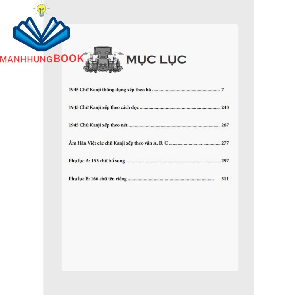 -Cuốn sách bao gồm 1945 chữ Kanji được sử dụng trong toàn bộ đời sống cũng như trong các văn bản của người Nhật. Có các phần tra cứu theo số nét, tra cứu theo âm Kanji Việt, cách đọc onyomi hoặc kunyomi … Ở mỗi chữ Kanji không chỉ có thông tin về ý nghĩa, âm Kanji Việt, thứ tự nét viết, cách đọc mà chúng tôi còn bổ sung thêm cả các từ vựng cũng như những câu văn ví dụ liên quan đến chữ Kanji đó để bạn đọc có được hình dung chính xác và đầy đủ nhất về chữ Kanji đó. Mặc dù đã rất cố gắng song trong quá trình biên soạn khó có thể tránh khỏi những sai sót nhỏ.