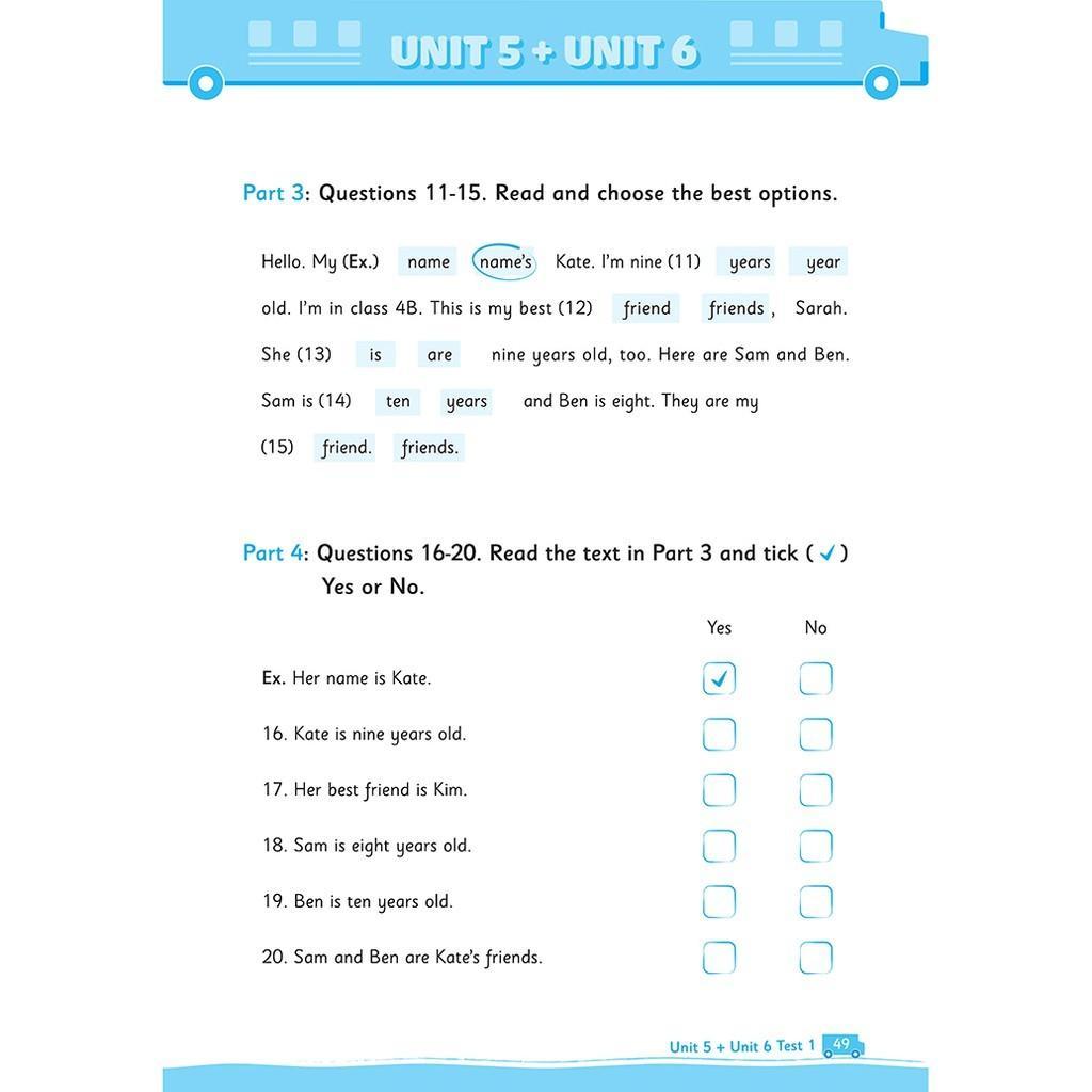 Cứ hai bài sẽ có 2 bài kiểm tra, tất cả các bài kiểm tra đều được thiết kế theo quy định thông tư mới nhất về kiểm tra môn Tiếng Anh tiểu học.