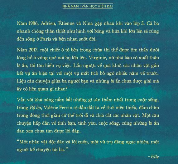 Vẫn với khả năng nắm bắt những gì sâu thẳm nhất trong cuộc sống, trong Bộ ba, Valérie Perrin sẽ dẫn dắt ta về thời niên thiếu, đắm chìm trong dòng thời gian cứ thế trôi đi và chia cắt các nhân vật. Một câu chuyện hấp dẫn về tình bạn, tình yêu, cuộc sống, cùng những bí ẩn đan xen chưa tìm được lời đáp.
