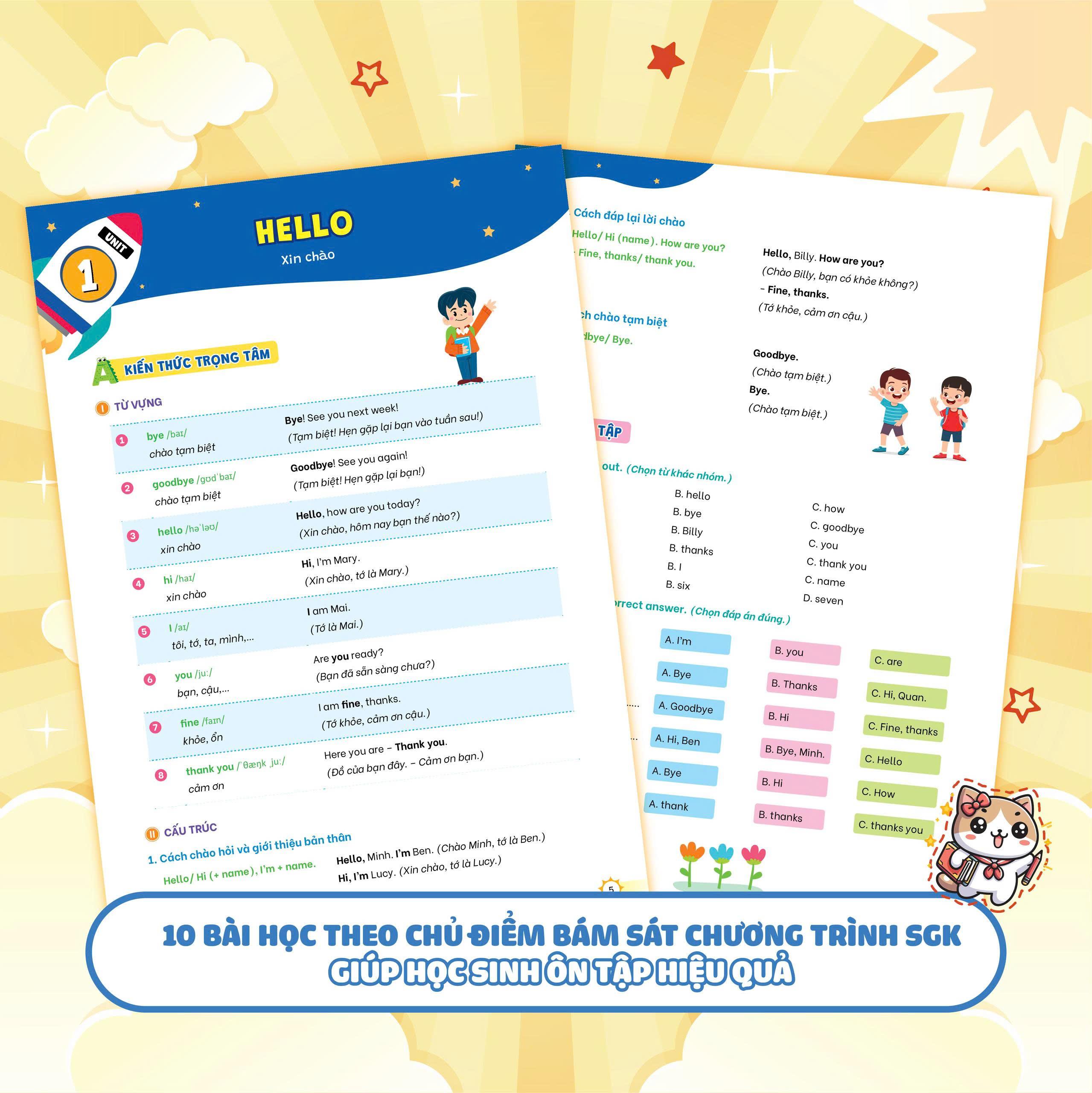 • Bám sát chương trình học chính khóa: Nội dung sách được xây dựng dựa trên khung chương trình Tiếng Anh lớp 3 hiện hành, đảm bảo tính cập nhật, chính xác và phù hợp với trình độ học sinh theo từng học kỳ. Các bài học và đề kiểm tra phản ánh sát thực tế dạy và học trong nhà trường.