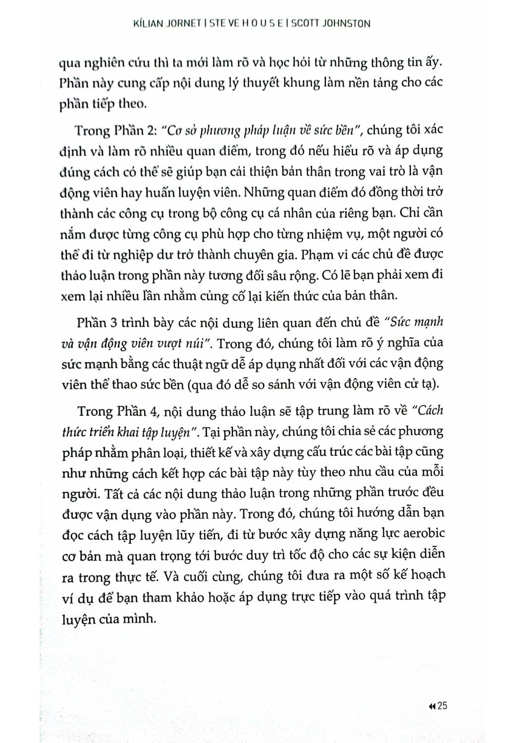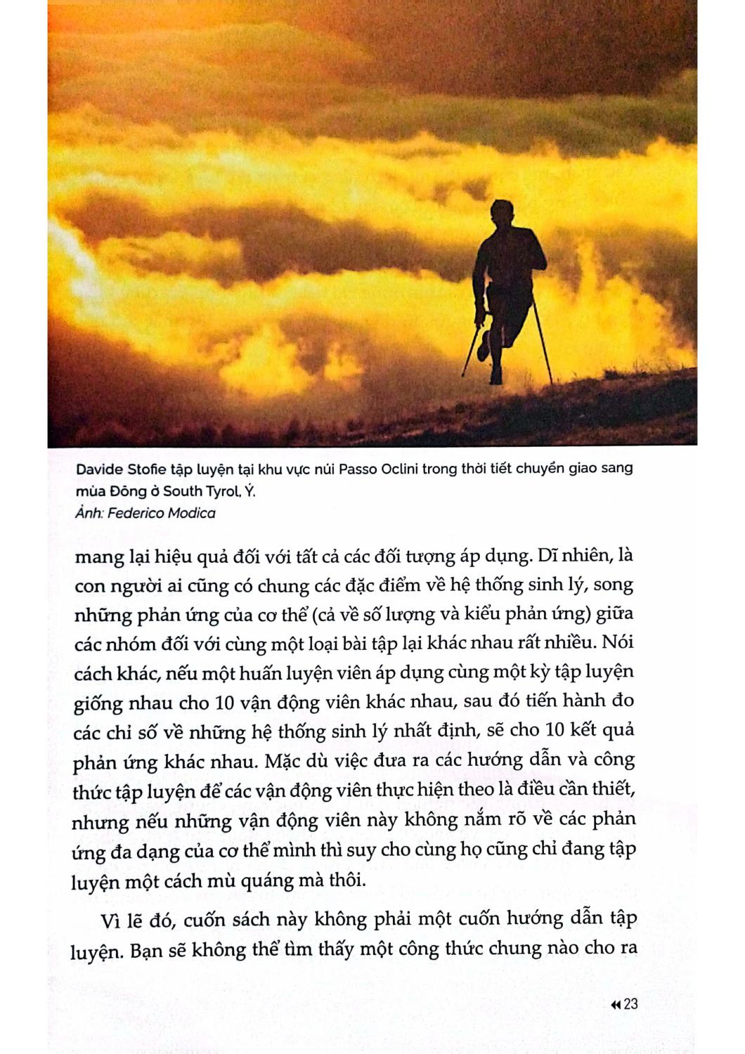 Chạy trail, leo núi trượt tuyết, skimo và chạy ultra ngày càng trở nên phổ biến trên thế giới. Cuốn sách đúc kết những kiến thức và kinh nghiệm của các vận động viên đỉnh cao, được củng cố bởi khoa học và thực tiễn, qua đó mang đến những thông tin hữu ích giúp các vận động viên thể thao ngoài trời tự xây dựng kế hoạch cá nhân nhằm đạt thành tích tốt nhất.