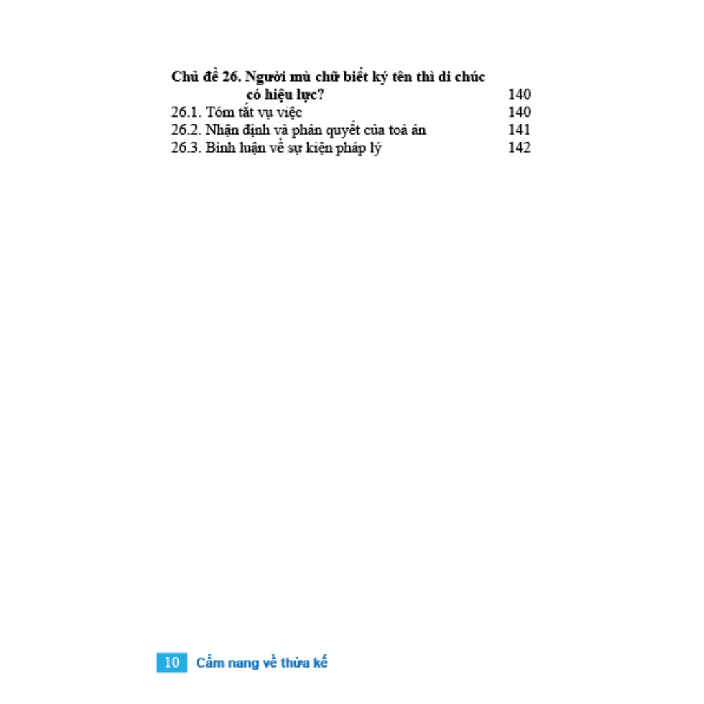 - Cẩm nang về thừa kế và 26 tình huống thực tế là cuốn sách được xây dựng dựa trên các tình huống pháp lý có thật, từ các bản án có hiệu lực của Toà án và được phân tích, bình luận, kết luận với văn phong đơn giản nhất nhằm đáp ứng độc giả không phải là các chuyên gia pháp lý.