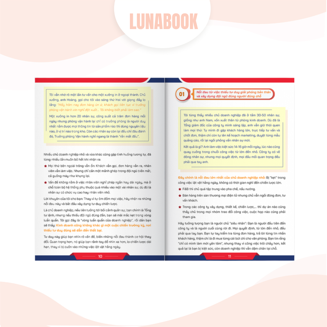 - Cuốn sách cung cấp những chiến lược thực tiễn để phân vai rõ ràng Sếp – Tướng – Binh, đồng thời xây dựng một hệ thống giao việc – kiểm soát – kế thừa hiệu quả. Nhờ đó, doanh nghiệp có thể vận hành trơn tru và bền vững, giúp người lãnh đạo thoát khỏi công việc chi tiết để tập trung vào chiến lược phát triển dài hạn.