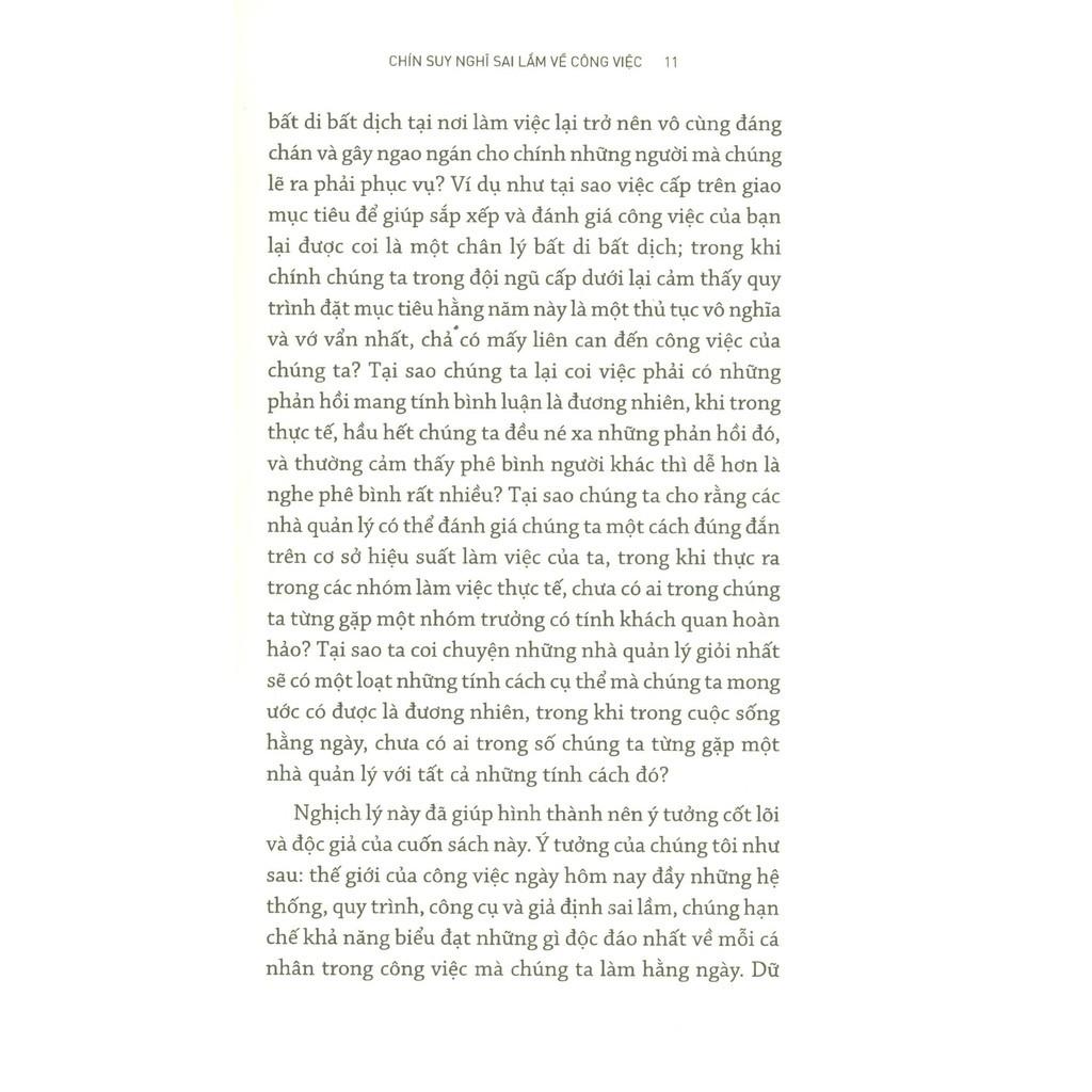 Những điều trên nghe ra có vẻ như là những chân lý nền tảng cho đời sống công việc của chúng ta ngày hôm nay. Nhưng thực ra, chúng là những điều không thật. Trong cuốn sách Chín suy nghĩ sai lầm về công việc gây tranh cãi và truyền cảm hứng này, chúng ta sẽ gặp những điều không thật này – những lệch lạc, những giả định đầy khuyết điểm, và suy nghĩ sai lầm – mỗi khi chúng ta tới nơi làm việc. Chúng dẫn đến rối loạn và thất vọng, và cuối cùng khiến công sở của chúng ta trở thành một cái bóng mờ nhạt của những gì lẽ-ra-có-thể-tốt-hơn.