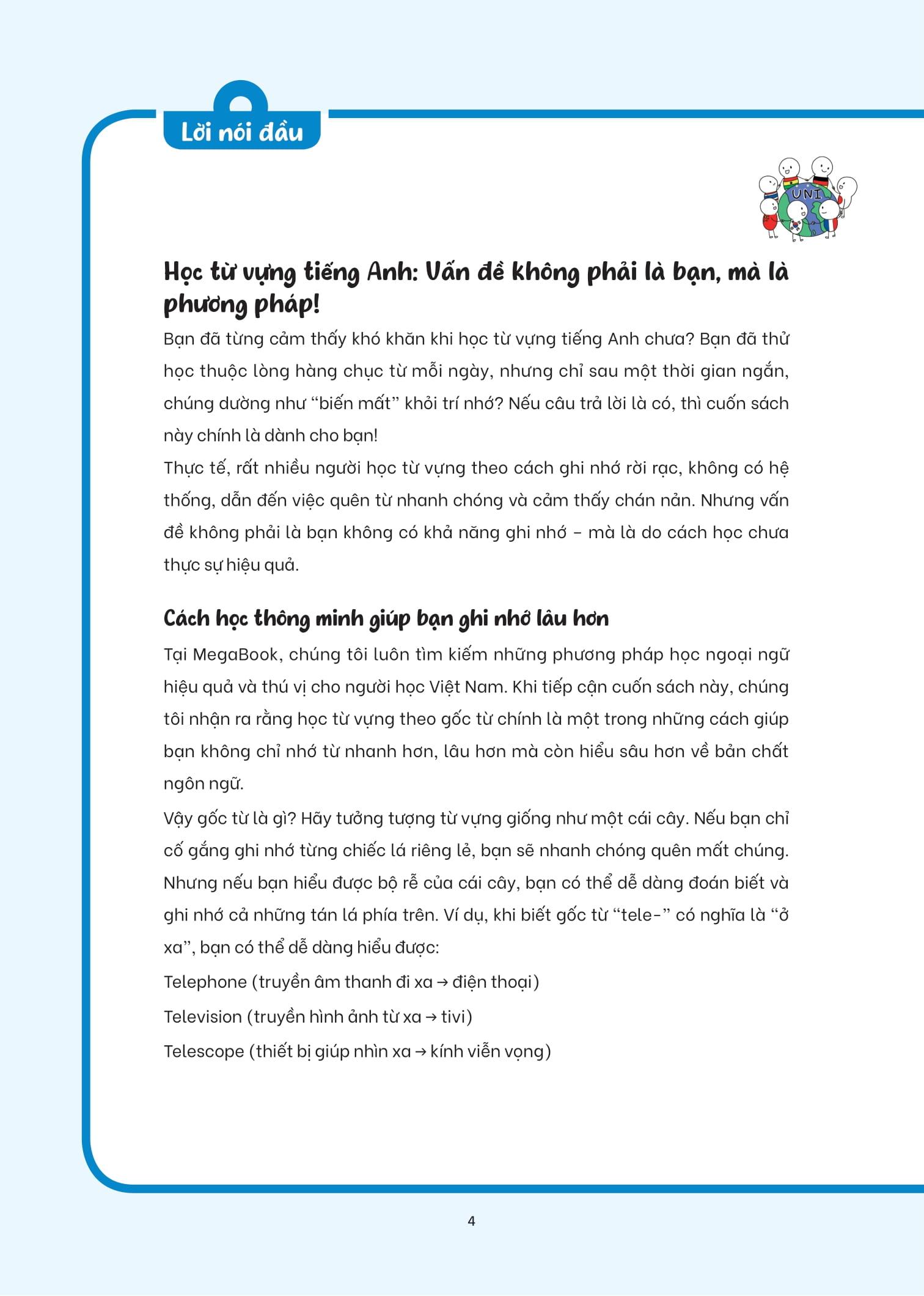 - Học từ vựng theo “gốc” – nắm chắc bản chất từ: Sách không chỉ đưa ra nghĩa mà phân tích chi tiết từng từ theo gốc – tiền tố – hậu tố, giúp bạn hiểu sâu và nhớ lâu, từ đó dễ dàng đoán nghĩa các từ mới liên quan mà không cần tra từ điển.