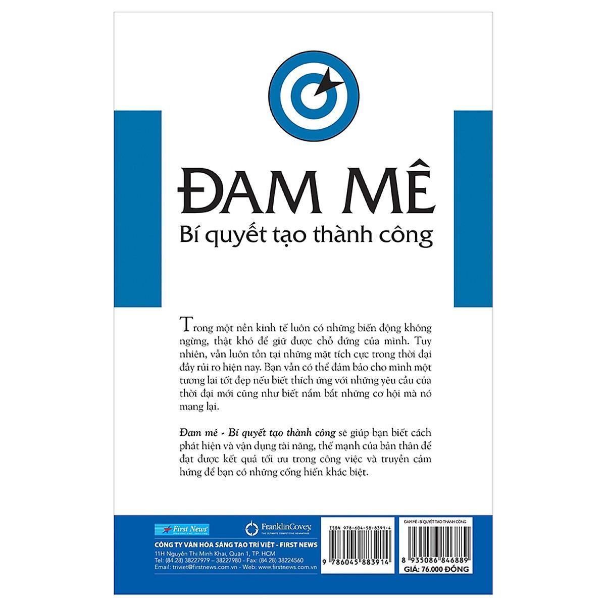 Trong một nền kinh tế luôn có những biến động không ngừng, thật khó để giữ được chỗ đứng của mình. Tuy nhiên, vẫn luôn tồn tại những mặt tích cực trong thời đại đầy rủi ro hiện nay. Bạn vẫn có thể đảm bảo cho mình một tương lai tốt đẹp nếu biết thích ứng với những yêu cầu của thời đại mới cũng như biết nắm bắt những cơ hội mà nó mang lại. "Đam mê - Bí quyết tạo thành công" sẽ giúp bạn biết cách phát hiện và vận dụng tài năng, thế mạnh của bản thân để đạt được kết quả tối ưu trong công việc và truyền cảm hứng để bạn có những cống hiến khác biệt. Nhận xét về "Đam mê - Bí quyết tạo thành công": “Thật tuyệt vời! Quan điểm độc đáo của hai tác giả Covey và Colosimo đã tạo nên một tác phẩm vượt thời gian. Đam mê – bí quyết tạo thành công mang ý nghĩa sâu sắc, đầy tính thuyết phục bởi nó thôi thúc mỗi người cần xác định cho mình một sự nghiệp đáng để cống hiến và theo đuổi đến cùng! Đây chính là một trong những cuốn sách giàu giá trị thực tiễn cũng như tràn đầy cảm hứng nhất trong thời đại của chúng ta”.