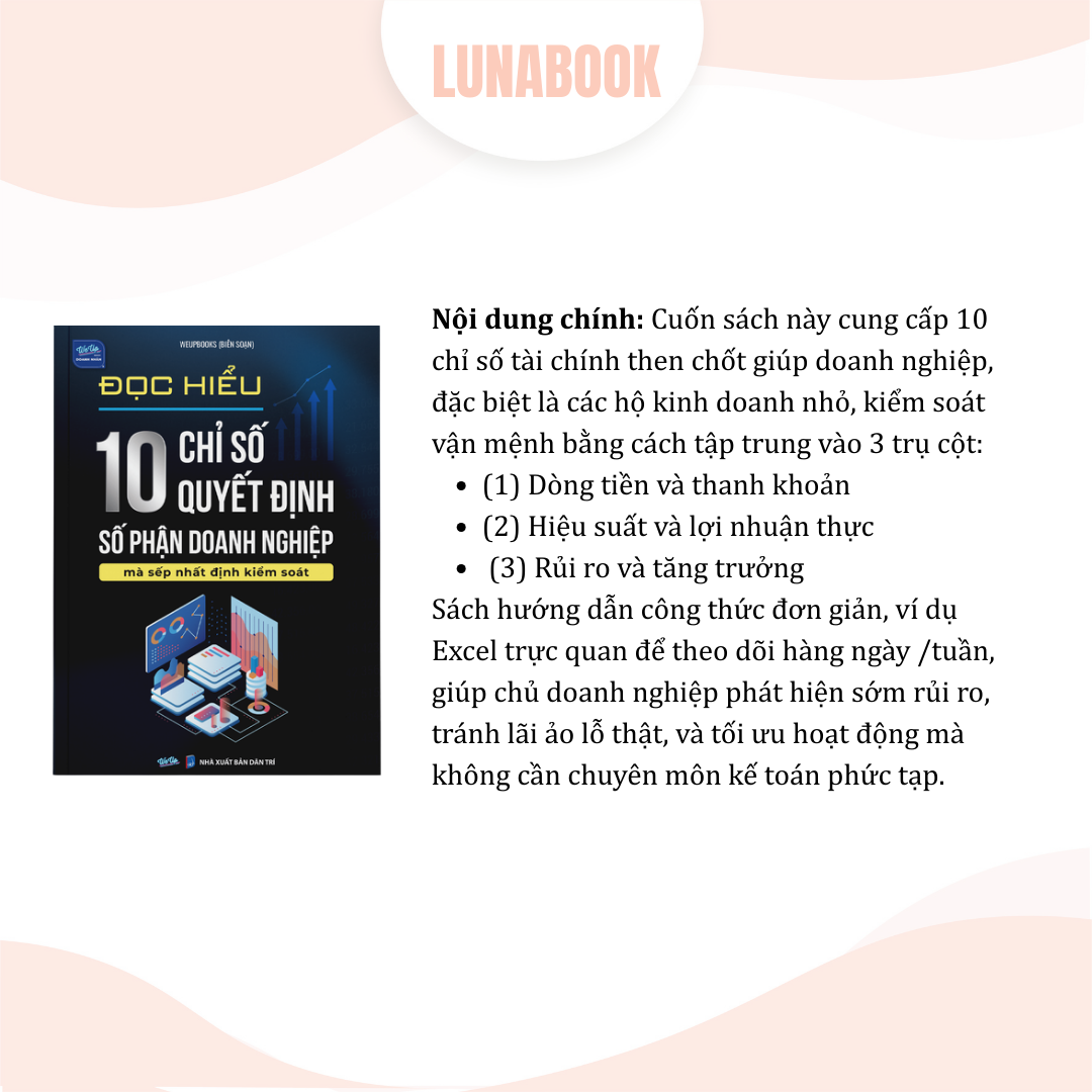 Mua tại TiktokĐọc hiểu 10 chỉ số quyết định số phận doanh nghiệp là cẩm nang thiết thực dành cho chủ doanh nghiệp, nhà quản lý, và bất kỳ ai muốn nắm vững sức khỏe tài chính của công ty mà không cần giỏi kế toán. Cuốn sách sẽ giúp bạn: