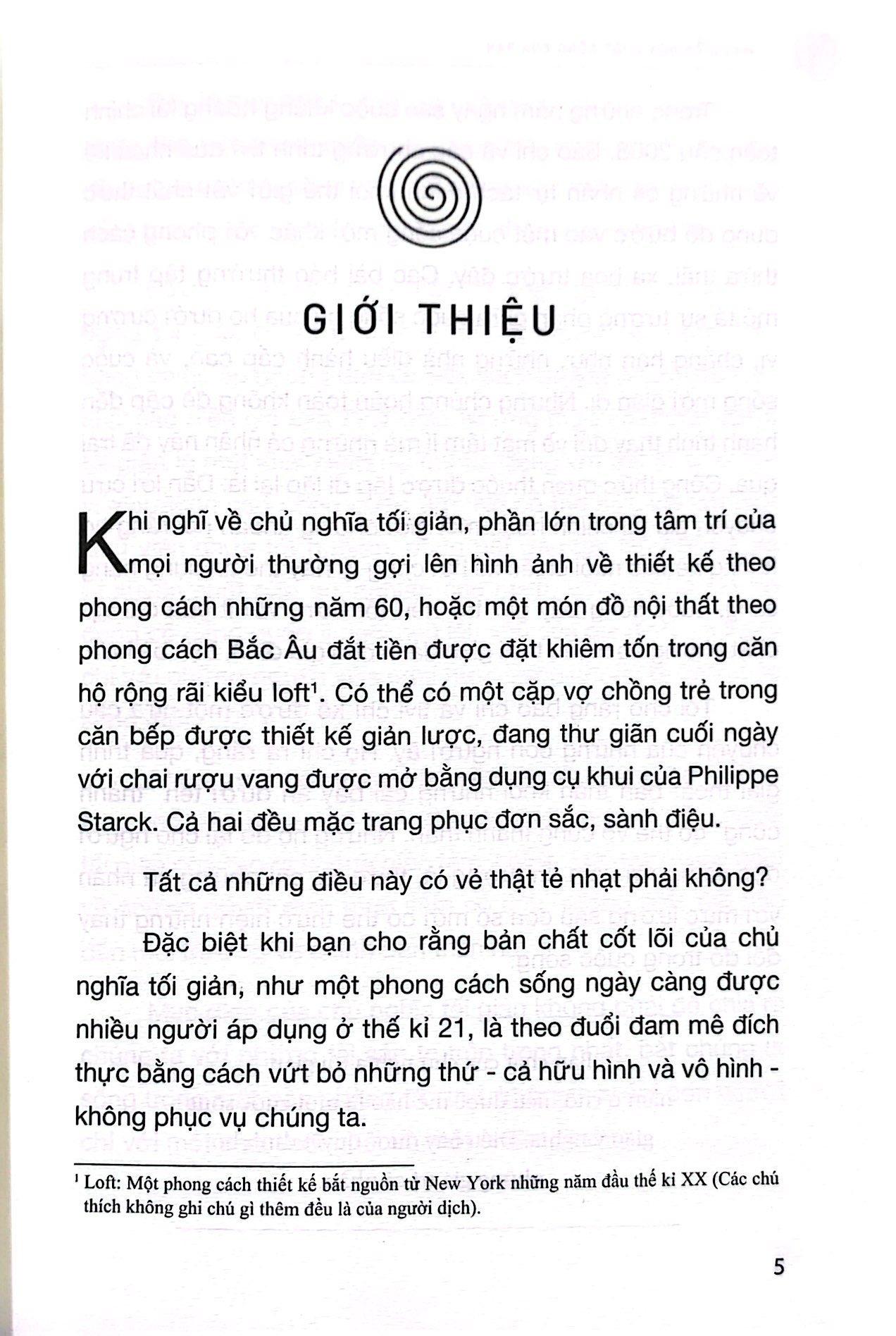Lối sống tối giản có ý nghĩa nhiều hơn là việc chỉ đơn thuần dọn dẹp bớt đồ đạc dư thừa. Cuốn sách được tác giả chấp bút với mục đích giúp các độc giả trân trọng và biết ơn nhiều hơn những điều m.ình đang có, tìm thấy sự giàu có và giá trị của cuộc sống sau khi bạn dọn dẹp cả không gian sống lẫn tâm trí m.ình để dành chỗ cho sự thỏa mãn, mục đích sống và niềm vui. Khi bạn loại bỏ tất cả những vật dụng không hữu ích, những thói quen và tư duy không mang lại giá trị nào trong cuộc sống, thì đó là lúc bạn có thêm không gian và tâm trí để kết nối với những điều phù hợp với những giá trị và mục tiêu của riêng bạn. Tối giản là chìa khóa giúp chúng ta có những lựa chọn có ý nghĩa, qua đó có thể kiểm soát cuộc sống một cách ý thức hơn.