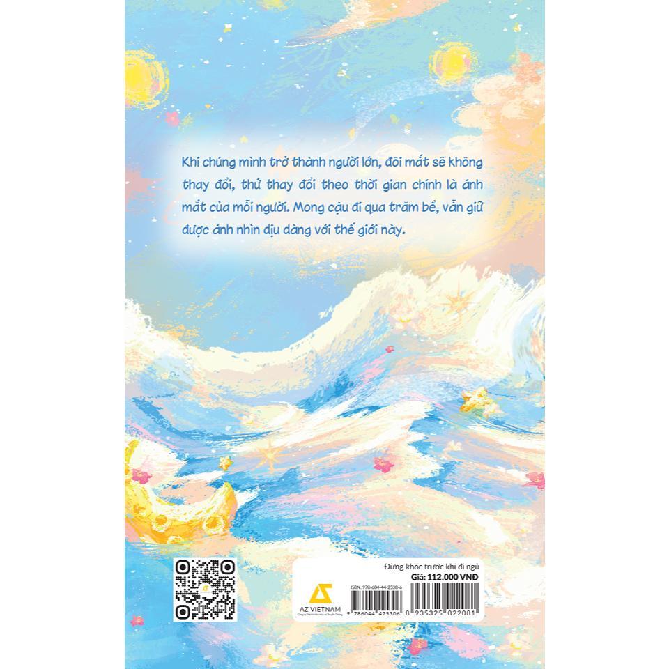 “Đừng khóc trước khi đi ngủ” tựa một cái ôm gửi đến bạn - những người đang cảm thấy cuộc sống này không dễ dàng. Vết thương nào rồi cũng sẽ lành, nhưng nếu bạn bỏ cuộc ngay vào thời khắc ấy, người yêu thương cậu sẽ mang những vết thương mới. Sự có mặt của bạn vốn dĩ vẫn luôn có ý nghĩa với rất nhiều người. Mong bạn có thể đóng gói muộn phiền, chuyển giao vào hòm thư cũ, sống một đời rực rỡ. Mắt bạn đẹp như vậy, cười lên xinh biết bao. Bạn cười lên rất đẹp, nhớ cười nhiều một chút, nhất định phải vì chính mình mà vui vẻ sống.