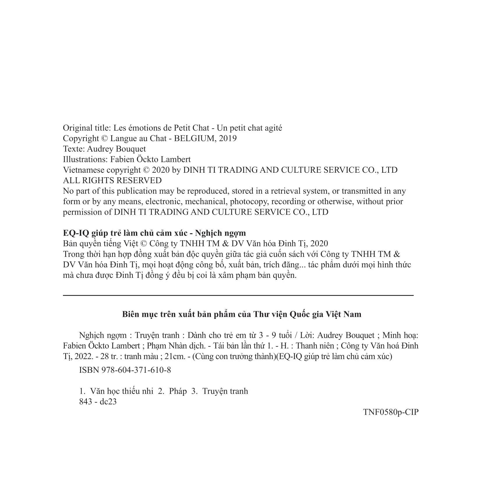 Để trả lời câu hỏi đó, Đinh Tị Books xin giới thiệu với bạn đọc bộ sách EQ-IQ giúp trẻ làm chủ cảm xúc được tác giả người Pháp Audrey Bouquet viết theo phương pháp tâm thể (sophrology) rất phổ biến ở châu Âu. Bộ sách gồm 8 cuốn với minh họa dễ thương sẽ kể cho các em nghe câu chuyện của bạn Mèo con ngộ nghĩnh, lồng ghép vào đó những bài học, lời khuyên và giải pháp để các em biết cách đối diện với nỗi sợ, nỗi lo lắng, cơn giận, niềm vui cũng như nhiều cảm xúc khác nữa.