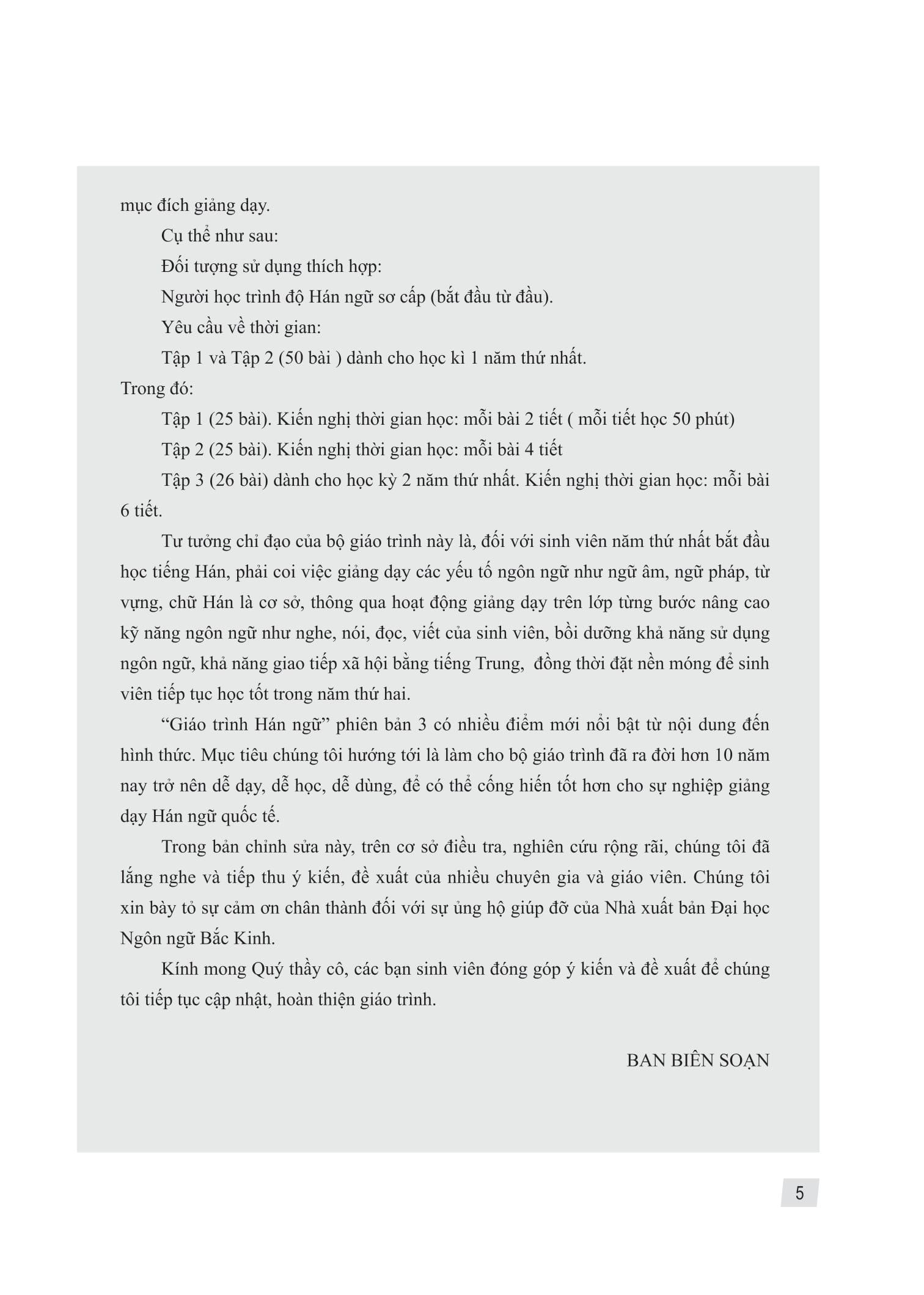 - Ngữ âm, ngữ pháp Bộ giáo trình dành 10 bài để giảng dạy ngữ âm. Nhưng nói một cách nghiêm túc, việc luyện tập ngữ âm, ngữ điệu cần phải xuyên suốt cả giai đoạn sơ cấp. Tầm quan trọng của việc luyện tập ngữ âm là rất lớn và cần đặc biệt nhấn mạnh. Phải lưu ý rằng, ở giai đoạn mẫu câu và đoạn văn, việc giảng dạy ngữ âm cần được tiến hành kết hợp với việc luyện đọc to và học thuộc bài khóa. Các bài luyện đọc ngữ âm được thiết kế trong phần bài tập chỉ mang tính chất gợi ý. Phần ngữ pháp của giáo trình sẽ không quá chú trọng tính hệ thống, thế nhưng nó được biên soạn theo nguyên tắc từ dễ đến khó, nắm bắt dần dần. Vì vậy, nếu không hoàn thành tốt nhiệm vụ giảng dạy của Tập 1 mà giảng dạy ngay vào Tập 3 sẽ gặp phải nhiều khó khăn. Cần nhấn mạnh rằng, bộ giáo trình này dựa vào cấu trúc ngữ pháp tiếng Hán để giảng dạy bài đọc, dạy sinh viên nói tiếng Trung theo kết cấu ngữ pháp. Do đó, việc giải thích ngữ pháp cần ngắn gọn, rõ ràng, đơn giản, mạch lạc, bắt đầu từ cấu trúc ngữ pháp rồi giải thích ngữ nghĩa, chức năng, ngữ dụng; dạy sinh viên cách vận dụng ngữ pháp để nói, viết, biểu đạt tiếng Hán. Trên lớp, giáo viên có thể sử dụng nhiều phương pháp hình tượng, trực quan như tranh ảnh, động tác, phần mềm máy tính… để giảng giải các hiện tượng ngữ pháp, giúp sinh viên nắm bắt ý nghĩa, chức năng và ngữ cảnh của từng điểm ngữ pháp nhằm nâng cao khả năng giao tiếp bằng tiếng Hán của sinh viên.