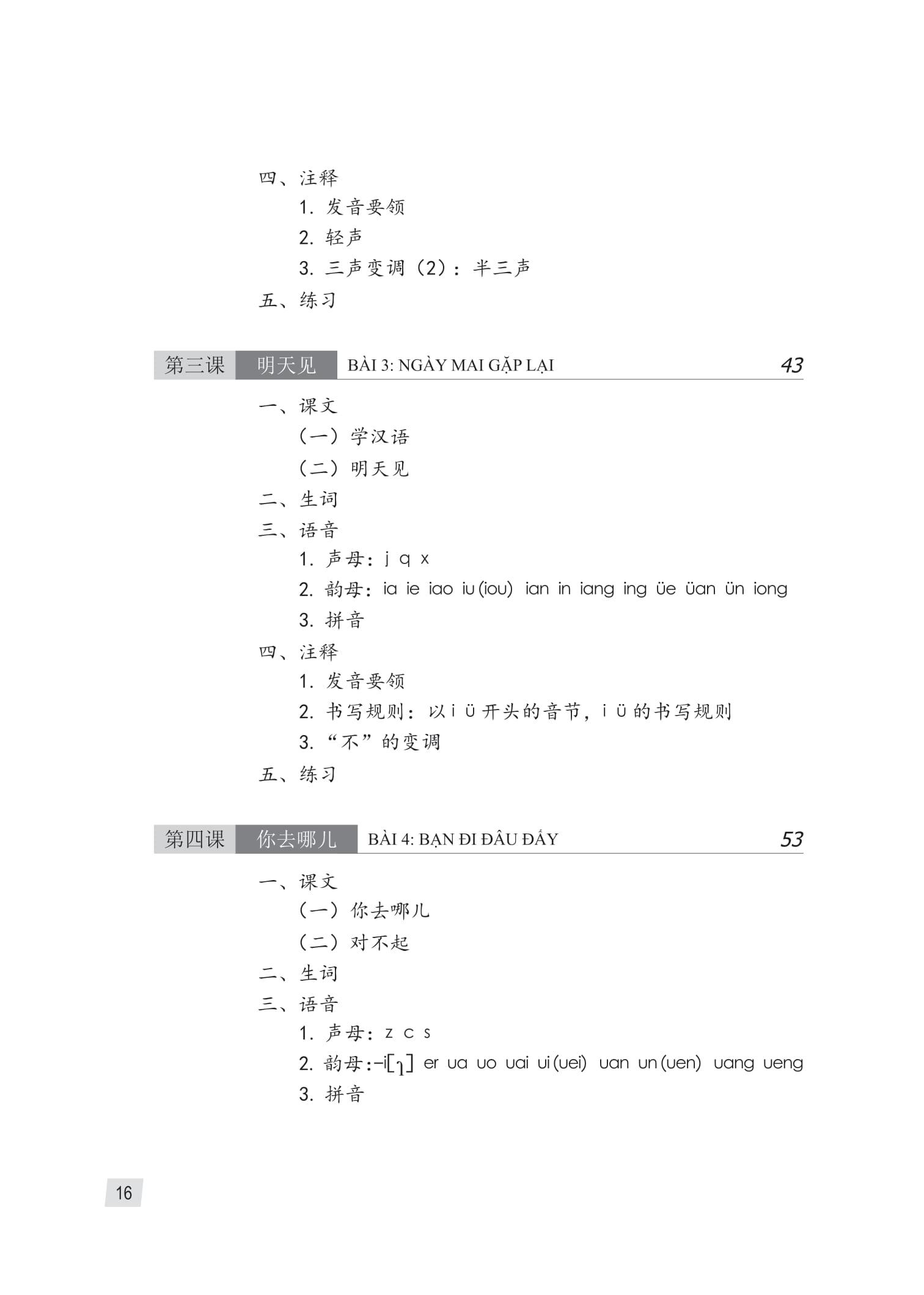- Chú thích Phần chú thích trong giai đoạn ngữ âm chủ yếu giới thiệu kiến thức cơ bản về ngữ âm tiếng Hán. Còn ở giai đoạn ngữ pháp và mẫu câu, chủ yếu giới thiệu và giải thích một số kiến thức trọng điểm về ngôn ngữ và bối cảnh văn hóa Trung Quốc. Đối với những câu có điểm ngữ pháp xuất hiện trong bài khóa nhưng chưa được giải thích, hãy để sinh viên được hiểu nghĩa thông qua phần dịch nội dung chú thích.