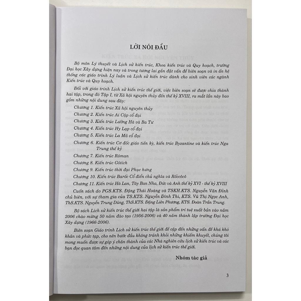 Đối với giáo trình Lịch sử kiến trúc thế giới, việc biên soạn sẽ được chia thành hai tập, trong đó Tập I, từ Xã hội nguyên thủy đến thế kỷ XVIII, ra mắt lần này bao gồm những nội dung sau đây: