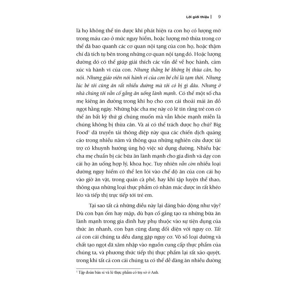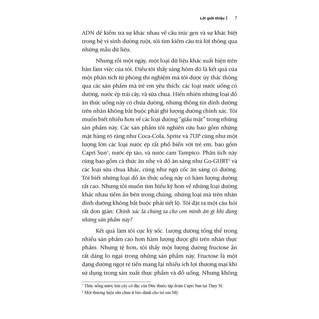 Tin tức khủng khiếp nhưng vẫn còn đó những hi vọng. Cuốn sách này chắc chắn sẽ mang đến cho các bậc phụ huynh những hướng dẫn cụ thể và những sự thật kinh ngạc về đường, tác động của đường đến với cơ thể và trí óc trẻ, nhưng đồng thời cũng sẽ chỉ ra những tiến bộ có thể thấy rõ rệt như trí nhớ được tăng cường, khả năng học tập và sức đề kháng khi chúng ta cắt giảm đường. Cuốn sách cung cấp cho độc giả những chiến lược để giảm đường, kế hoạch dần dần loại bỏ đường ra khỏi chế độ ăn thông qua Thử thách 7 Ngày và 28 Ngày, kèm theo những gợi ý về bữa ăn và cách để mọi người trong gia đình cùng tham gia vào chiến dịch “chống đường” ngọt ngào này, mang đến một khởi đầu mới cho thế hệ tương lai.