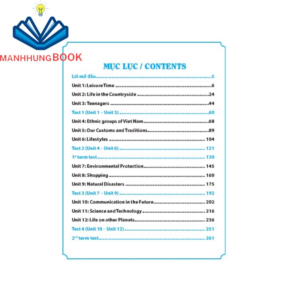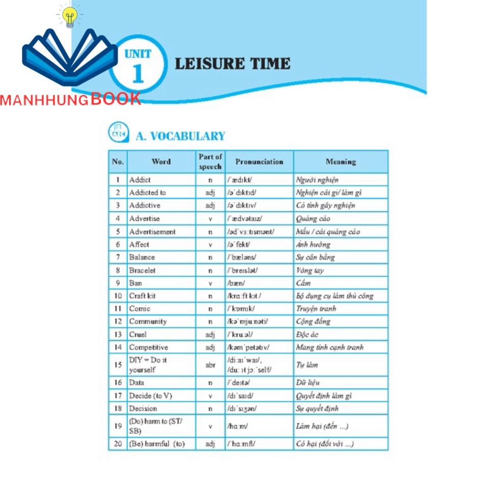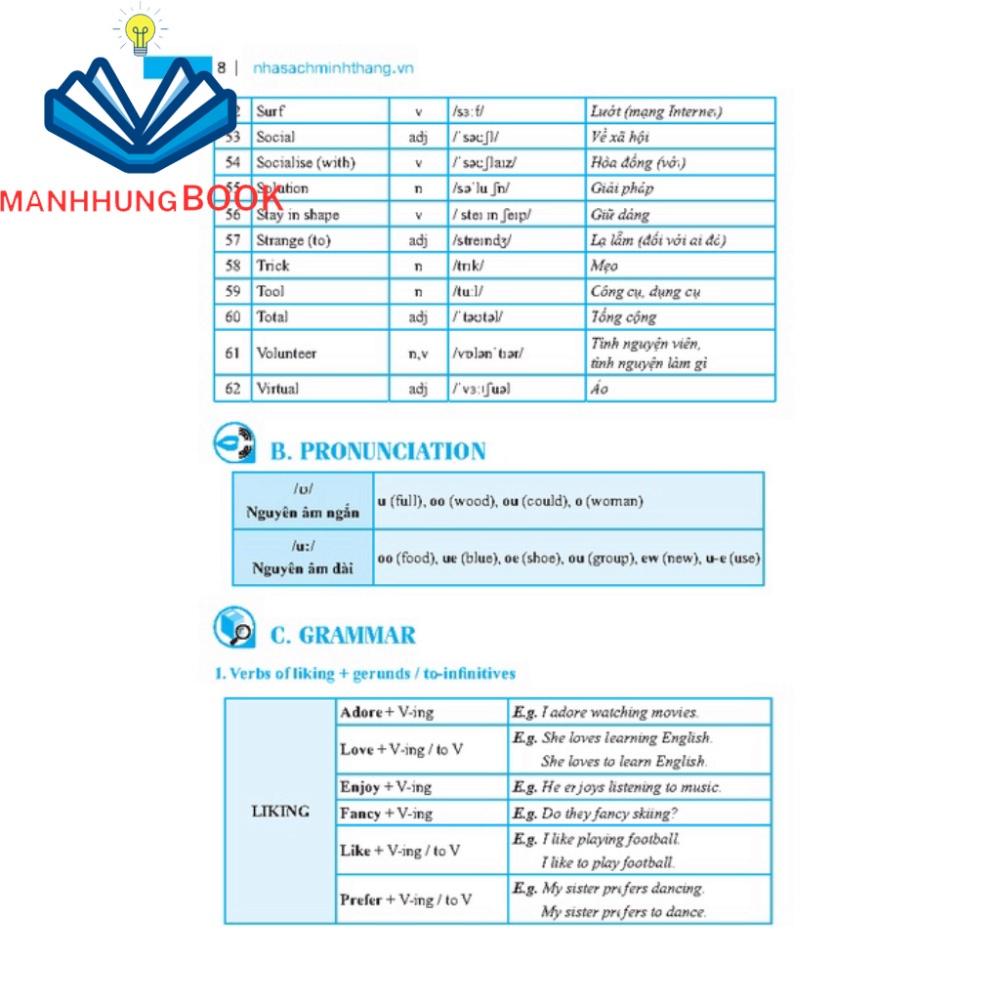 *Mỗi đơn vị bài tập gồm 4 phần:PART A: VOCABULARY (Từ vựng theo từng đơn vị bài học)PART B: PRONUNCIATION (Lý thuyết phát âm)PART C: GRAMMAR (Lý thuyết ngữ pháp trọng tâm)PART D: PRACTICE (Củng cố phát âm, từ vựng, ngữ pháp, kỹ năng đọc và kỹ năng viết)