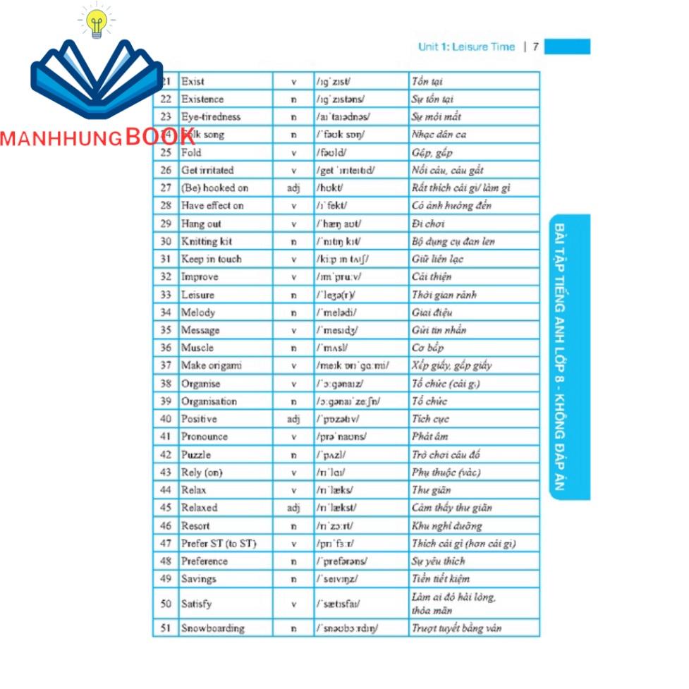 “BÀI TẬP TIẾNG ANH LỚP 8” với các dạng bài tập phong phú, đa dạng, bám sát ngữ pháp và từ vựng theo chủ đề từng đơn vị bài tập.