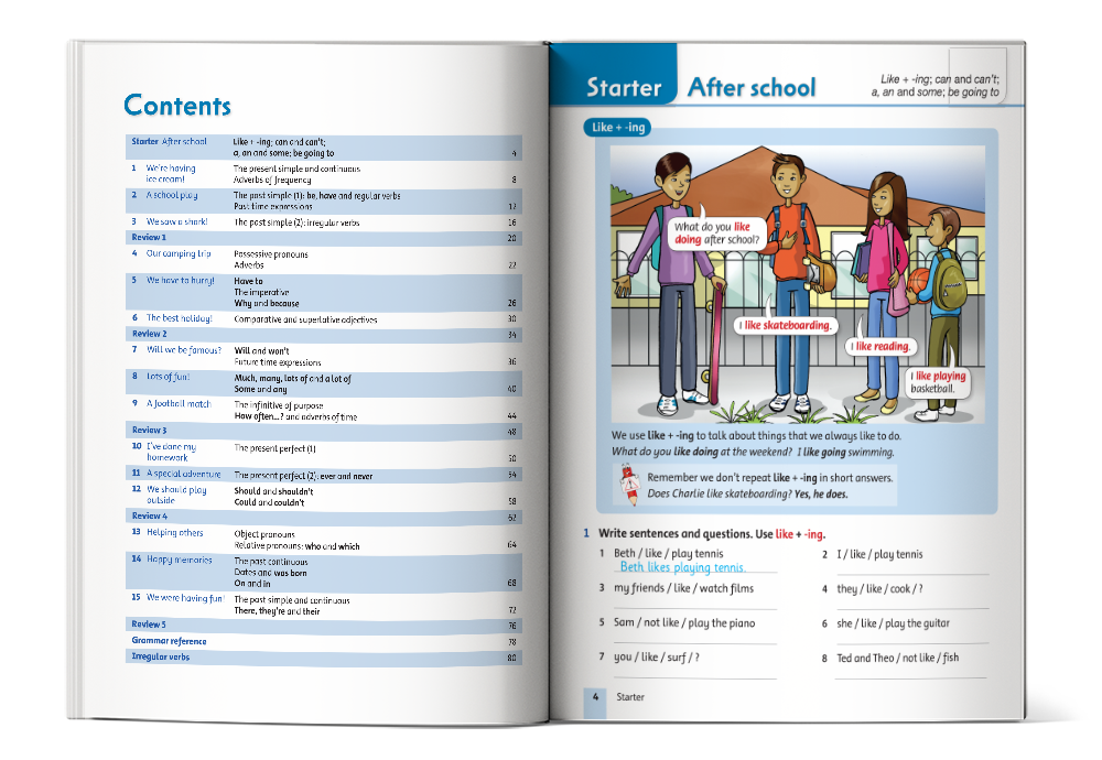 Cuốn sách gồm 15 bài học chính, được chia thành từng giai đoạn với các phần ôn tập (Review). Mỗi bài tập trung rèn luyện những chủ điểm ngữ pháp quan trọng: