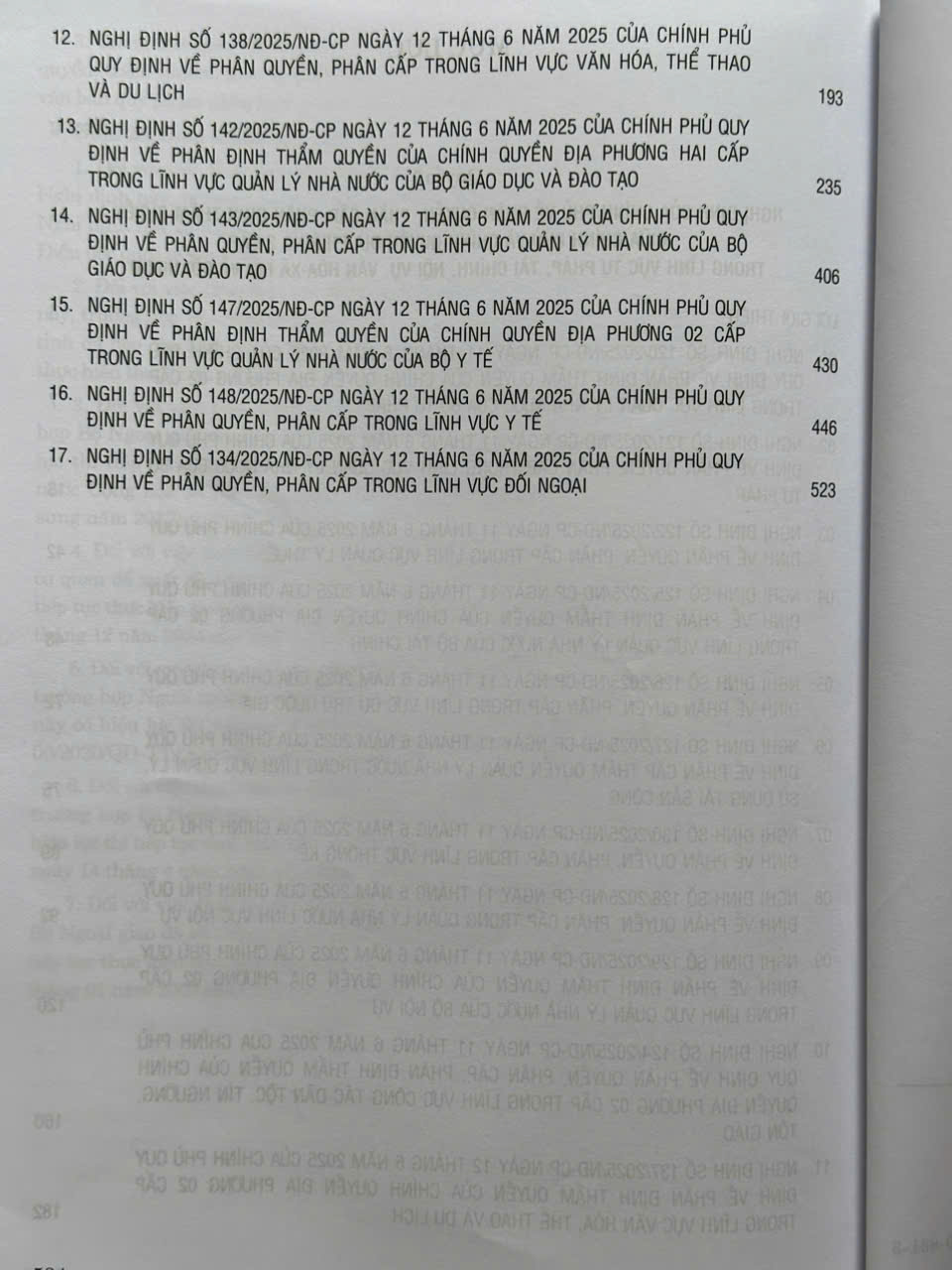 Quyển 1: Các Nghị định về phân quyền, phân cấp; phân định thẩm quyền giữa chính phủ và chính quyền địa phương 2 cấp trong lĩnh vực tư pháp, tài chính, nội vụ, văn hóa – xã hội và đối ngoại (sách phát hành tháng 8/2025, dày 536 trang, giá bìa: 395.000 đồng/cuốn)