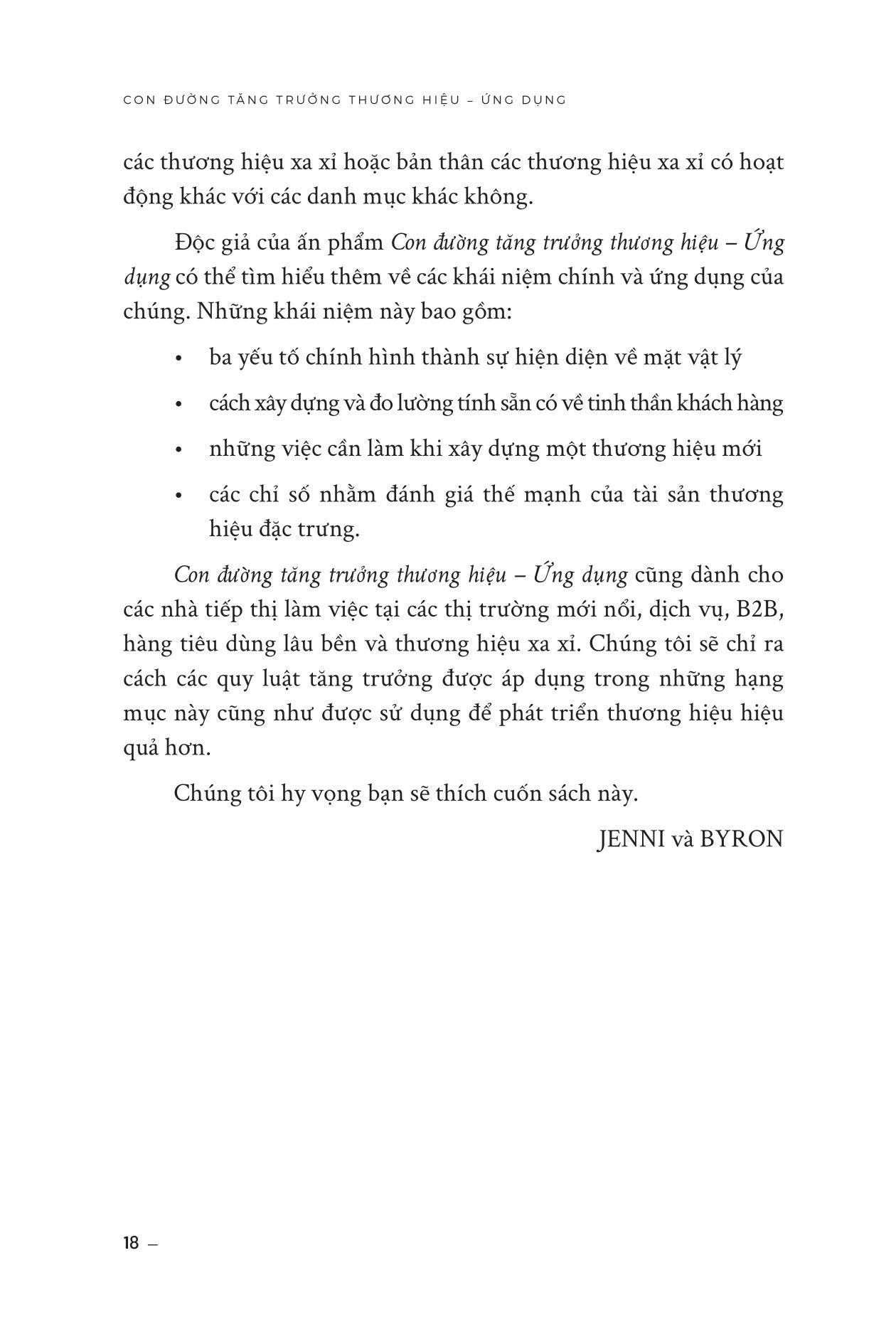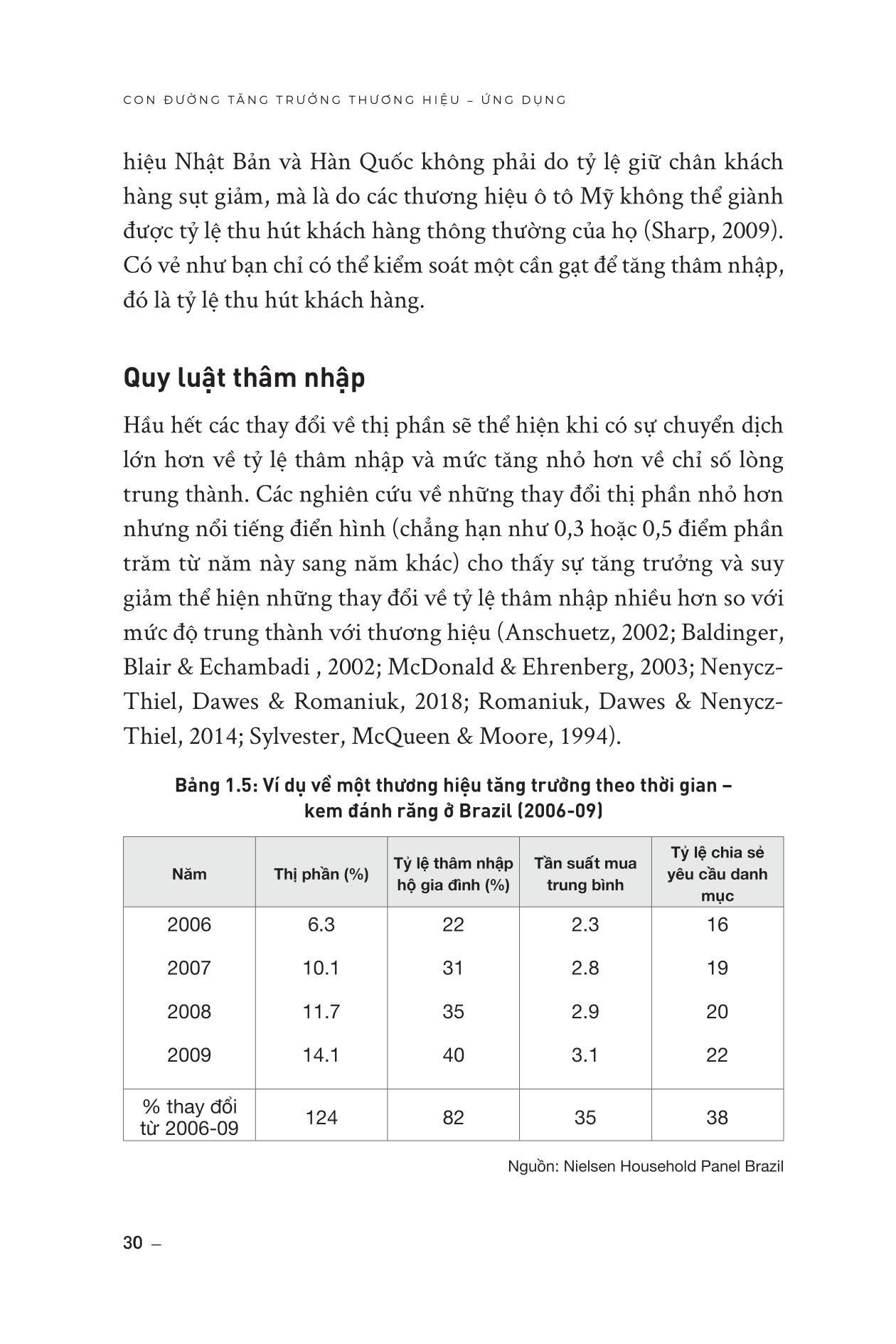 - Tập trung vào các hoạt động marketing định kỳ, như quảng cáo liên tục và khuyến mãi, để giữ chân khách hàng hiện có. Cuốn sách này có gì đặc biệt? Đầu tiên, cuốn sách giúp độc giả hiểu rõ hơn về cách các khách hàng thực sự mua hàng và tương tác với thương hiệu. Các nhà quản lý sẽ học được cách phát hiện ra các yếu tố quan trọng trong quá trình mua hàng và cách thiết lập mối quan hệ với khách hàng của m.ình. Thứ hai, cuốn sách chỉ ra các công cụ và phương pháp nghiên cứu giúp độc giả hiểu rõ hơn về thị trường và khách hàng của họ, đồng thời đánh giá các yếu tố ảnh hưởng đến quyết định mua hàng của khách hàng cũng như cách tạo ra trải nghiệm khách hàng tốt nhất để tăng trưởng doanh số bán hàng. Cuối cùng, cuốn sách mang lại cho độc giả một cái nhìn toàn diện về tăng trưởng thương hiệu và doanh số bán hàng không chỉ trong các thị trường phát triển mà còn ở các thị trường mới nổi, dịch vụ, hàng tiêu dùng, B2B và thương hiệu sang trọng. Các độc giả sẽ học được cách phát triển chiến lược marketing hiệu quả và tăng trưởng doanh số bán hàng trong nhiều loại hình thị trường khác nhau. Cuốn sách này dành cho ai? Cuốn sách hướng tới độc giả là các nhà quản lý thương hiệu, các chuyên gia marketing, các nhà nghiên cứu cũng như những người cần giải quyết các công việc liên quan đến tăng trưởng thương hiệu và phát triển chiến lược marketing hiệu quả. Các độc giả mong muốn có thêm các kiến thức và phương pháp để phát triển chiến lược marketing và tăng trưởng doanh số bán hàng. Cuốn sách giúp các độc giả hiểu rõ hơn về các yếu tố quan trọng để thu hút khách hàng mới và giữ chân khách hàng hiện có, cũng như đưa ra các khuyến nghị cụ thể về cách tăng trưởng thương hiệu trong các thị trường mới nổi, dịch vụ, hàng tiêu dùng, B2B và thương hiệu xa xỉ. Giới thiệu về tác giả Giáo sư Byron Sharp là Giám đốc Viện Khoa học Tiếp thị Ehrenberg-Bass tại Đại học Nam Úc. Nghiên cứu cơ bản của Viện được sử dụng và hỗ trợ tài chính bởi nhiều tập đoàn hàng đầu thế giới bao gồm Coca-Cola, Kraft, Kellogg's, British Airways, Procter & Gamble, Nielsen, TNS, Turner Broadcasting, Network Ten, Simplot, Mars và nhiều tập đoàn khác. Tiến sĩ Sharp đã xuất bản hơn 100 bài báo học thuật và là thành viên ban biên tập của năm tạp chí. Gần đây, ông đồng tổ chức một hội nghị tại Trường Kinh doanh Wharton về luật quảng cáo và cùng với Giáo sư Jerry Wind, đang biên tập một số đặc biệt của Tạp chí Nghiên cứu Quảng cáo về chủ đề này. Giáo sư Jenni Romaniuk là Phó Giám đốc (Quốc tế) của Viện Ehrenberg-Bass, Đại học Nam Úc. Trước đây, Jenni là biên tập viên điều hành của Tạp chí Nghiên cứu Quảng cáo, và hiện là thành viên Ban Cố vấn Cấp cao của Tạp chí. Đánh giá về cuốn sách “Nếu đã đọc và yêu thích Con đường tăng trưởng thương hiệu phần 2, đã đến lúc bạn cần chuyển sang cấp độ tiếp thị cao hơn. Và nếu chưa đọc, hãy chuẩn bị sẵn sàng -- cuốn sách này sẽ thay đổi cách bạn tư duy về tiếp thị mãi mãi.” - Goodreads “Đây là cuốn sách không thể bỏ qua đối với bất kỳ ai đang làm việc trong lĩnh vực Tiếp thị và Xây dựng Thương hiệu. Nếu bạn dày dạn kinh nghiệm, hãy từ những gì bạn NGHĨ bạn biết và đọc cuốn sách này.” - Henry Manampiring, tác giả