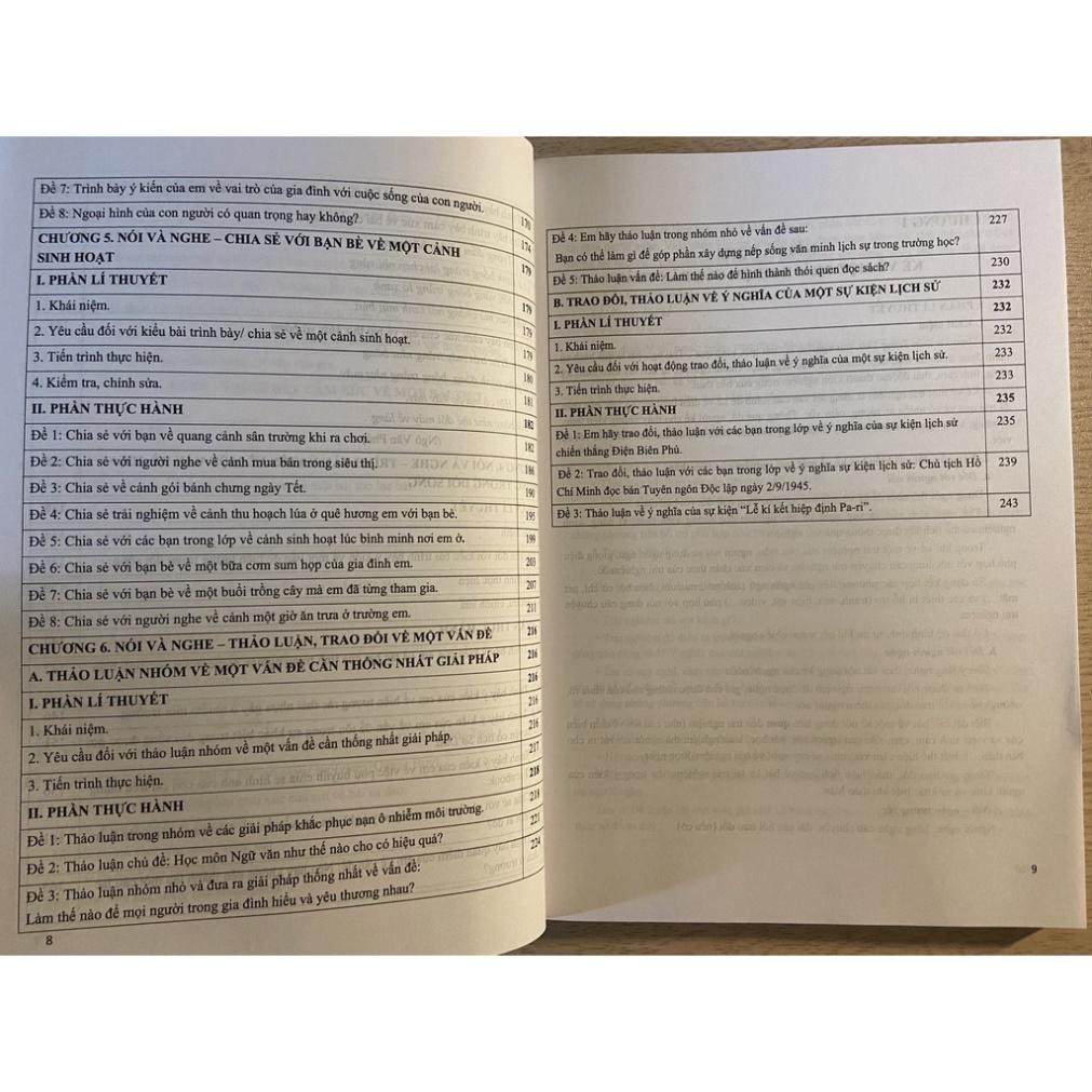 Cuốn sách Hướng dẫn thực hành nói và nghe trong môn Ngữ văn 6 theo nhằm hướng Chương trình Giáo dục phổ thông mới (dùng chung cho ba bộ sách Kết nối tri thức với cuộc sống; Cánh diều, Chân trời sáng tạo) được biên soạn dẫn học sinh thực hành nói – nghe đối với năng lực nói – nghe của học sinh ti sống nói chung. kiểu bài cụ thể; từ đó phát triển e đối với các kiêu bài c sinh trong môn học c Ngữ văn nói riêng, tr trong cuộc Cuốn sách tập trung hướng dẫn thực hành nói – nghe các kiểu bài: Kể về một trải nghiệm của bản thân; Kể lại một truyện cổ tích/ truyền thuyết; Trình bày cảm xúc về một bài thơ lục bát; Trình bày ý kiến về một vấn đề, hiện tượng trong đời sống; Chia sẻ với bạn bè về một cảnh sinh hoạt; Thảo luận nhóm về một vấn đề cần thống nhất giải pháp; Trao đổi, thảo luận về ý nghĩa của một sự kiện lịch sử. Mỗi kiểu bài được cấu trúc gồm hai phần: Phần lí thuyết và phần thực hành. Phần lí thuyết cung cấp khái niệm, yêu cầu, tiến trình thực hiện và các tiêu chí tiến hành đánh giá, kiểm tra chỉnh sửa đối với kiểu bài đó. Phần thực hành là minh chứng cụ thể sự vận dụng những hướng dẫn trong phần lý thuyết vào một số đề văn theo các bước: trước khi nói, trong khi nói và sau khi nói