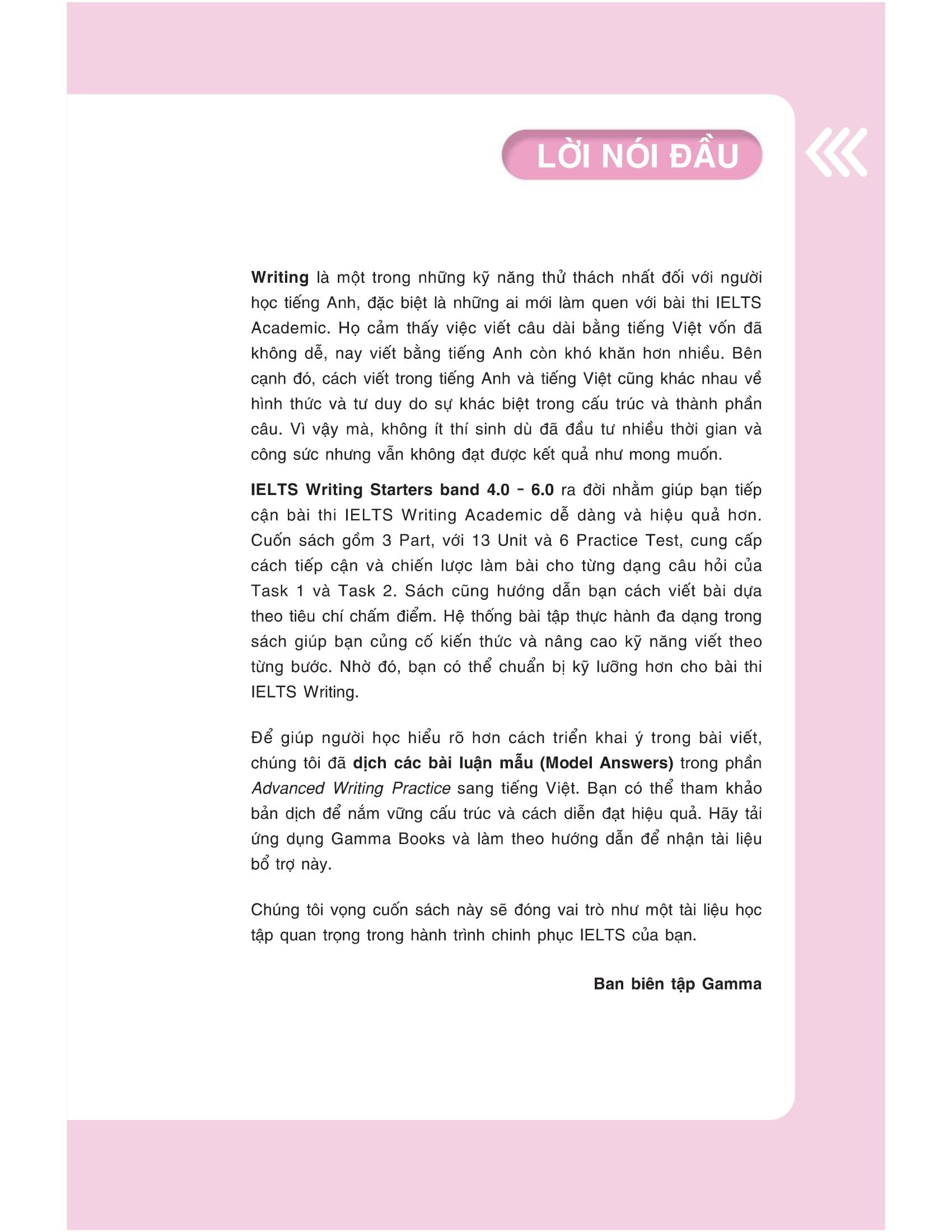 IELTS Writing Starters band 4.0 – 6.0 là cuốn sách dành cho những ai mới bắt đầu làm quen với bài thi viết IELTS Academic Module, đặc biệt là những thí sinh gặp khó khăn trong việc diễn đạt ý tưởng bằng tiếng Anh mạch lạc và hiệu quả. Cuốn sách không chỉ cung cấp các hướng dẫn chi tiết về từng dạng bài trong Task 1 và Task 2 mà còn giúp người học phát triển tư duy viết, cải thiện vốn từ vựng và nâng cao khả năng lập luận.