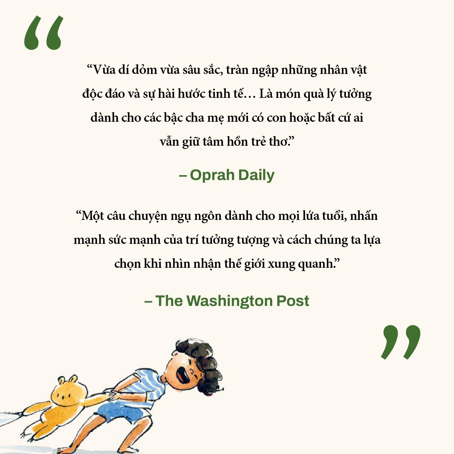 - SABINA HAHN lớn lên ở Riga, Latvia, và hiện đang sống ở New York. Từ khi còn nhỏ, cô đã mê đọc sách và không thể dừng vẽ nguệch ngoạc, điều này đã dẫn dắt cô vào thế giới sách thiếu nhi. Tài năng lớn nhất của cô là truyền tải được sự hài hước tinh tế và sự dịu dàng của cả thế giới đời sống hằng ngày lẫn những thế giới tưởng tượng. VỀ NỘI DUNG SÁCH Cũng giống như quyển sách nổi tiếng The Boy, the Mole, the Fox (tạm dịch: Cậu bé, Chuột chũi, Cáo và Ngựa), đây là một câu chuyện ngụ ngôn với tranh minh họa tuyệt đẹp kể về hành trình của một cậu bé bước ra thế giới bên ngoài, rời khỏi bóng râm của ngôi nhà thân thuộc. Trong khung cảnh kỳ diệu ấy, cậu khám phá những bí mật của sự sẻ chia, kết nối và tìm thấy sự bình yên bên những người m.ình yêu thương. Với lối kể chuyện hóm hỉnh và giàu trí tưởng tượng đặc trưng của Trevor Noah, kết hợp với nghệ sĩ minh họa có phong cách độc đáo Sabina Hahn, đây là một câu chuyện dành cho độc giả ở mọi lứa tuổi, để đọc to cùng nhau hoặc lặng lẽ thưởng thức một m.ình. Đây là một quyển sách kể về vùng đất chưa được khám phá, ngay bên ngoài bóng râm của ngôi nhà, cùng những bài học chúng ta nhận được từ bối cảnh đầy những điều bất ngờ và khó đoán đó. Đây là câu chuyện về những khác biệt, những bất đồng, nhưng cũng là câu chuyện về cách chúng ta vượt qua những khoảng cách đó và tìm thấy điều quan trọng nhất đối với m.ình, dù chúng ta giữ vai trò là cha mẹ hay con cái, hàng xóm, thần lùn giữ vườn hay thậm chí là những đối thủ trên chính trường. Đây là một quyển sách tranh, nhưng không phải sách dành riêng cho trẻ em. Đây là quyển sách để con cái chia sẻ với cha mẹ và để cha mẹ chia sẻ với con cái. Thế giới trong sách là nơi cả cha mẹ lẫn con cái cùng nhau khám phá hành trình khi trí tưởng tượng đưa họ đi xa. Nếu bạn vừa có con vừa có cha mẹ, hoặc không có cả hai, bạn vẫn có thể đọc quyển sách này cho chính m.ình, cho một người lạ hoặc cho một ai đó mà bạn yêu thương, thậm chí là đọc cho một chú ốc sên đang bò bên đường. QUOTES
