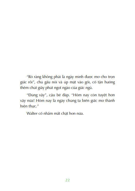 - Cậu bé vẫn chưa thấy thuyết phục. “Mẹ thì biết gì về chuyện làm trẻ con chứ?” “Thật ra, m.ình nghĩ người lớn nào cũng từng là trẻ con. Họ lớn lên từ đó mà!”, Walter đáp. “Chuyện đó chưa chắc đâu. Tớ đã sống với mẹ kể từ khi tớ chào đời, mà lúc nào tớ cũng thấy mẹ là người lớn!”