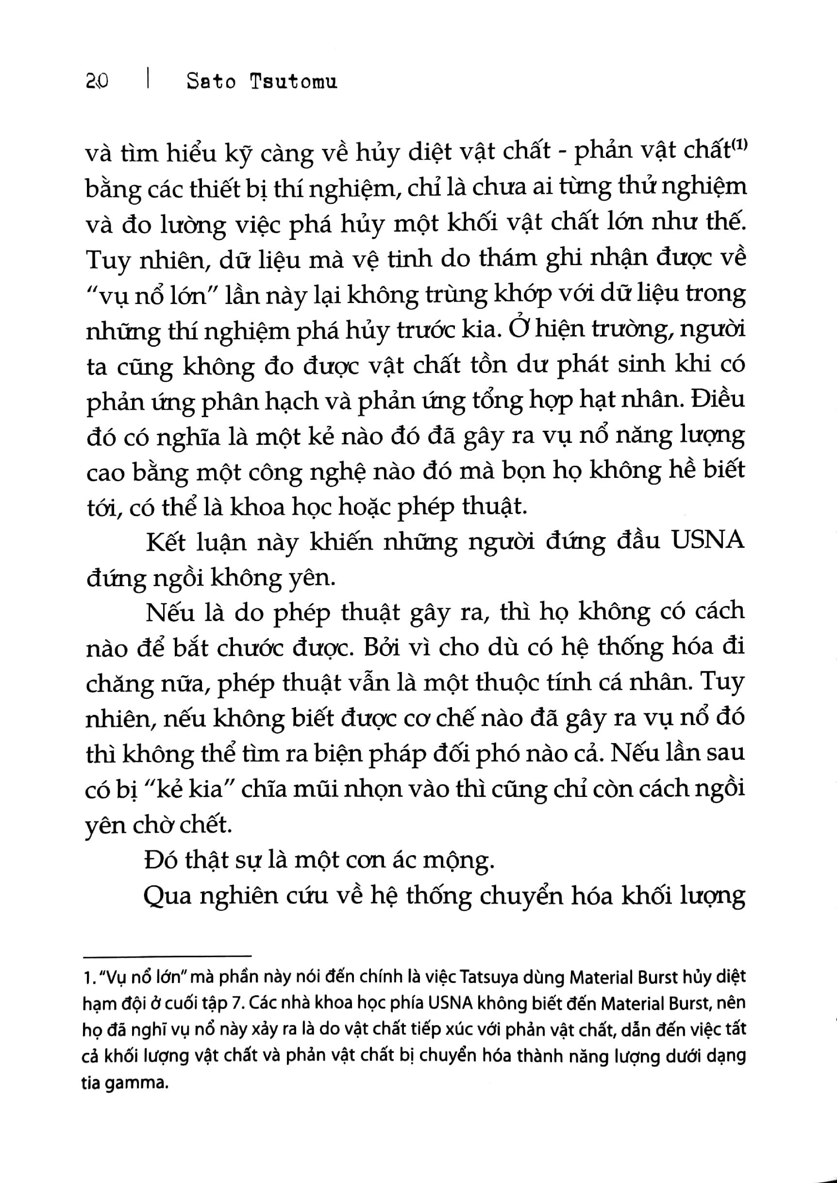 Kitayama Shizuku, bạn cùng lớp của Miyuki sẽ đi du học ở USNA (Hợp chúng quốc Bắc Mỹ). Trong thời đại này, để tránh thất thoát gien di truyền cũng như tài nguyên quân sự, các pháp sư có trình độ cao bị chính phủ giới hạn (hoặc có thể nói là nghiêm cấm) xuất ngoại. Mặc dù vậy, Shizuku vẫn được cho phép đi du học theo diện trao đổi. Angelina Kudou Shields, người nhập học trường trung học phép thuật thể chỗ cho Shizuku đã sang Mỹ, là một cô gái với mái tóc vàng và đôi mắt xanh biếc. Từ cái nhìn đầu tiên, Tatsuya đã ngay lập tức nhận ra danh tính của cô một trong “mười ba sứ đồ”, một pháp sư cấp chiến lược ngang tầm v.ũ khí hủy diệt hàng loạt, kiêm tổng đội trưởng đội pháp sư STARS. Đối đầu với “Tia lửa”, pháp sư mạnh nhất của quân đội Hoa Kỳ được cử đến trường trung học phép thuật, Tatsuya sẽ phải làm gì đây? VỀ TÁC GIẢ Sato Tsutomu Sato Tsutomu sinh năm 19XX tại một miền quê hẻo lánh của Nhật Bản. Anh từng xem thể loại khoa học viễn tưởng về vũ trụ là lương thực để sống qua thời niên thiếu. Thời thanh niên Sato Tsutomu chuyển sang đam mê thể loại giả tưởng và tiểu thuyết truyền kỳ. Sau khi tốt nghiệp, anh bán linh hồn cho thế giới hiện thực trong vai trò một chiến binh công sở (dù chỉ là lính lác). Năm 2011, anh trở lại thế giới giả tưởng trên cương vị một nhà văn cho tuổi teen ra mắt muộn màng. Minh họa: Ishida Kana Ishida Kana sinh năm 19XX. Đây là lần đầu cô làm công việc vẽ minh họa. Công việc chính của cô là họa sĩ phim hoạt hình. Những tác phẩm điển hình trước đây của Ishida Kana là CODE GEASS: Lelouch of the Rebellion, Mobile Suit Gundam Unicorn (giám sát hình ảnh), Ore no Imoto ga Konnani Kawaii Wake ga Nai (đạo diễn hình ảnh)…
