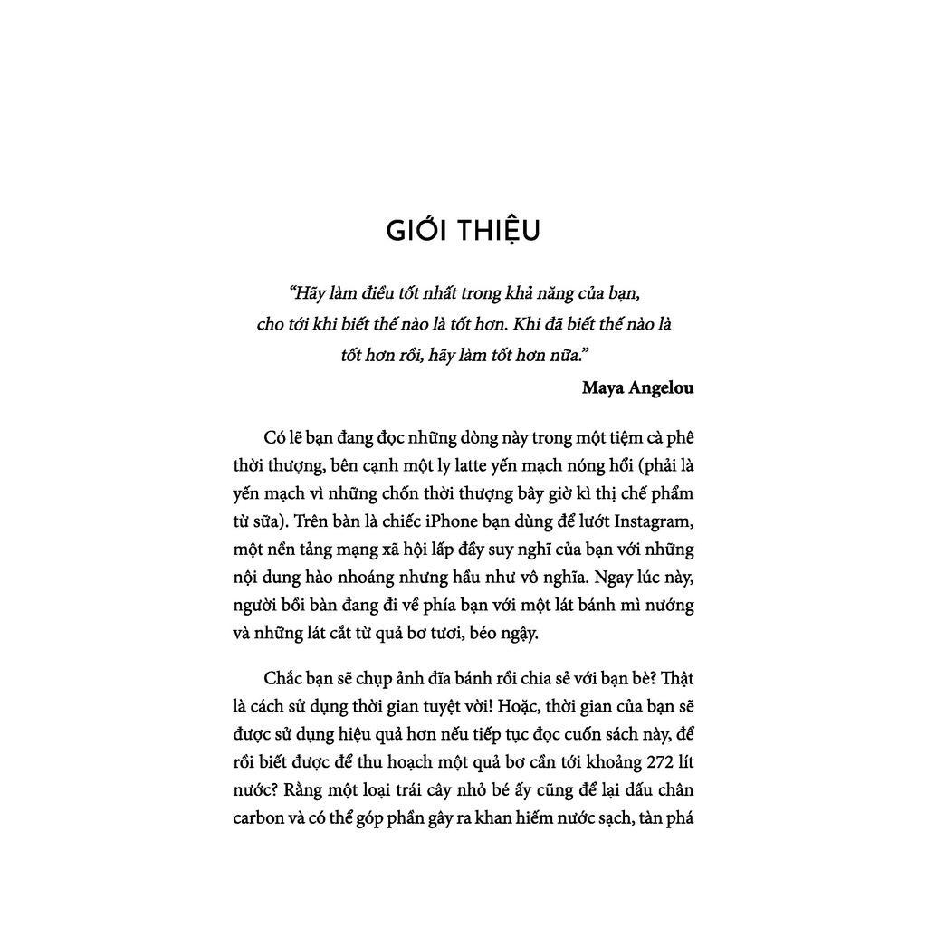 Điều quan trọng là cần thành thật về những giải pháp thay thế xanh mà các cá nhân có thể và sẽ làm được ngay lập tức để tạo nên ảnh hưởng lên bức tranh toàn cảnh về biến đổi khí hậu. Nếu tất cả những người tiêu dùng đều lập tức ngừng sử dụng xe hơi và máy bay, ngừng mua hàng “fast fashion”, ngừng ăn thịt và sử dụng đồ nhựa, thì mọi sự cũng không thể được giải quyết trong một sớm một chiều được. Những nỗ lực đó chỉ là một giọt nước so với cả đại dương nếu xét đến mức thiệt hại mà con người đã gây ra cho hành tinh trong vòng 100 năm qua. Tuy nhiên, khi cuốn sách soi sáng sự thật về cách chúng ta sống và thế giới mà những người tiêu dùng chúng ta đã và đang xây dựng, bạn sẽ có trong tay thông tin về rất nhiều ngành công nghiệp, cùng những giải pháp để thay đổi. Người sáng lập Tổ chức Ocean Generation, Daisy Kendrick, đã lồng ghép những câu chuyện tràn đầy cảm hứng với những dữ liệu kinh ngạc và trình bày nhiều ý tưởng cùng giải pháp để chúng ta sống xanh, thay đổi cuộc sống thường nhật của mỗi cá nhân trong chúng ta, nhằm tạo nên chất xúc tác thay đổi cho thế hệ tương lai.