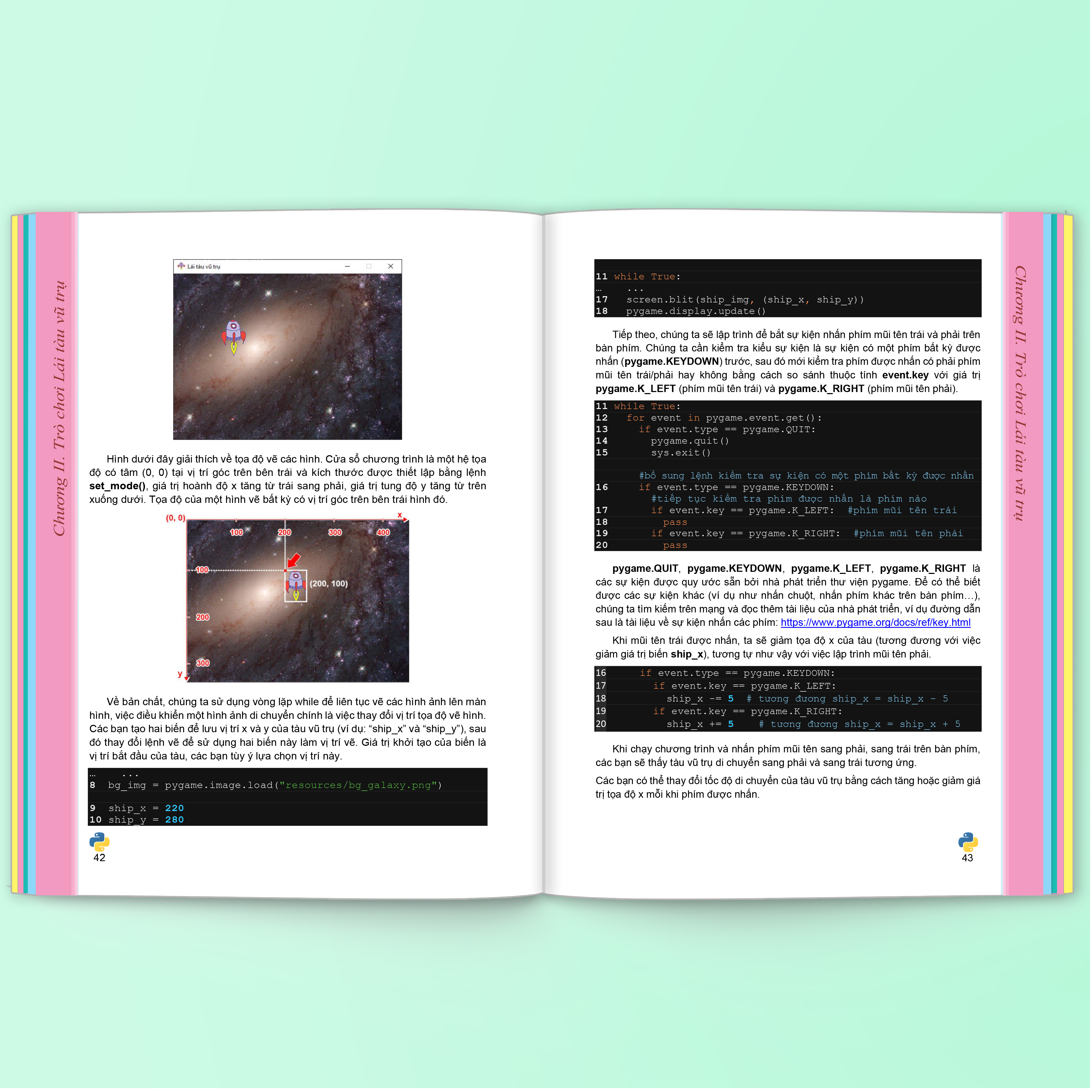 • Chương 2: Tìm hiểu lập trình đồ họa với thư viện Pygame và tạo ra trò chơi Lái tàu vũ trụ, qua đó cung cấp kiến thức cơ bản về lập trình như vòng lặp, sự kiện, cấu trúc rẽ nhánh…