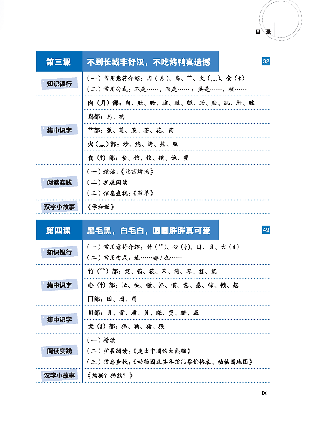 1. Ngân hàng tri thức Mảng này giảng giải những tri thức cơ sở về chữ Hán, đồng thời thiết kế phần “Luyện tập” để kiểm tra tình hình lý giải và nắm bắt của học sinh. Phần giảng giải đơn giản, rõ ràng, dễ hiểu, có kèm theo phần dịch tiếng Việt, điều này giúp người học giảm bớt tâm trạng ngại khó khi học chữ Hán, nắm được phương pháp học tập chính xác, nâng cao hứng thú và hiệu suất học tập. Bài 1 và bài 2 chủ yếu giới thiệu về các nét chữ và quy tắc bút thuận của chữ Hán. Bài 3 đến bài 7 giới thiệu về cấu tạo cơ bản của chữ Hán, giảng giải một cách hệ thống về chữ tượng hình, chữ chỉ sự, chữ hội ý và chữ hình thanh; phần chữ hình thanh được chia thành hai bài, một bài chủ yếu giảng giải về ý phù (hình bàng), một bài chủ yếu giảng giải về thanh phù (thanh bàng). Bài 8 giảng giải về ba hiện tượng chữ cận hình, chữ đồng âm và chữ đa âm tồn tại trong tiếng Hán. Bài 9 giới thiệu về mối quan hệ giữa chữ Hán và từ.