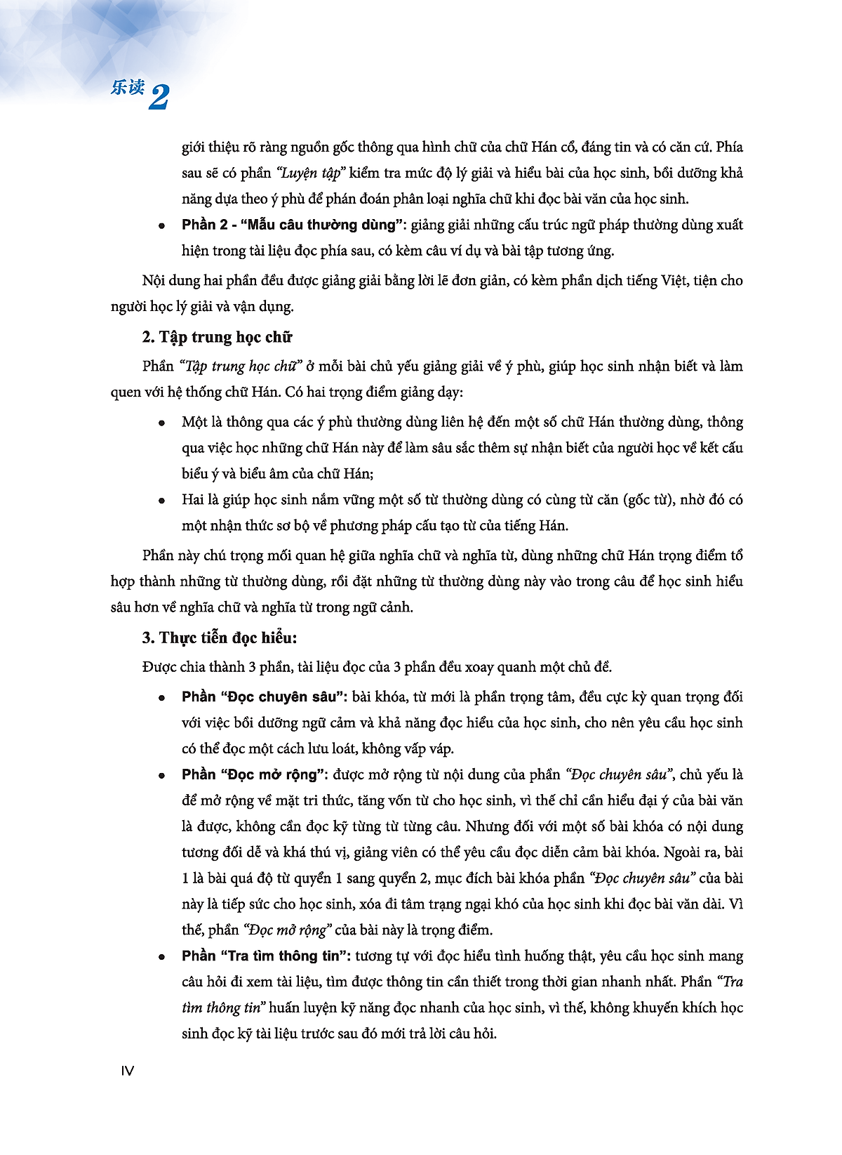 LeDu - Giáo Trình Môn Đọc Hiểu Tiếng Trung - Tập 2 “Le Du - Giáo trình môn Đọc hiểu tiếng Trung, quyển 2” là giáo trình đọc hiểu cấp nhập môn. Mục tiêu giảng dạy của quyển này là bắt đầu từ các nét chữ Hán, thông qua sự dẫn dắt, liên hệ của các ý phù (hình bàng) giúp học sinh tập trung học chữ, mở rộng vốn từ, sau đó thông qua đọc câu và đoạn văn ngắn để củng cố lại từ mới, bồi dưỡng hứng thú đọc cho học sinh, huấn luyện khả năng đọc hiểu của học sinh. Quyển giáo trình này thích hợp sử dụng cho người học tiếng Trung sơ cấp từ chưa biết gì (khởi điểm bằng 0) hoặc đã nắm được khoảng 50 từ ngữ HSK cấp 1. Việc chọn chữ, chọn từ của quyển giáo trình này đều tham khảo từ “Bảng chữ Hán thông dụng” và “Bảng từ ngữ tiếng Hán thông dụng” trong “Đại cương chương trình giảng dạy Hán ngữ quốc tế thông dụng”. Toàn bộ từ mới được chia thành hai phần gồm “Học để nhớ” và “Học để đọc” (sau những từ “học để đọc” có thêm dấu * để phân biệt). Từ vựng ở phần “Học để nhớ” đa số được lấy từ bảng từ cấp 1, bảng từ cấp 2 trong “Đại cương chương trình giảng dạy Hán ngữ quốc tế thông dụng”. Từ mới của phần “Học để nhớ” sẽ xuất hiện trong bảng từ mới ở cuối sách. Từ mới của phần “Học để đọc” chỉ được thiết lập nhằm mở rộng vốn từ cho học sinh và quét sạch chướng ngại khi đọc, nên không cần học sinh ghi nhớ. Từ mới của phần “Học để đọc” không xuất hiện trong bảng từ mới ở cuối sách. Quyển sách này xem trọng việc xuất hiện lặp lại của từ mới, đa số từ mới sẽ xuất hiện lặp đi lặp lại trong cả quyển sách, học sinh xem nhiều tự nhiên sẽ ghi nhớ. Thể lệ của giáo trình Nội dung quyển giáo trình này về cơ bản được sắp xếp theo thứ tự “nét chữ → ý phù (hình bàng) → chữ → từ → câu → đoạn”, cả quyển sách tổng cộng 10 bài, bài cuối cùng là phần kiểm tra tổng kết đối với nội dung của 9 bài trước đó, chủ yếu kiểm tra mức độ nắm vững của học sinh đối với kiến thức cơ bản về chữ Hán và từ mới của phần “Học để nhớ”, dạng đề tham khảo đề thi thật HSK cấp 1, cấp 2. Mỗi bài được chia thành 3 mảng lớn: Ngân hàng tri thức, Tập trung học chữ, Thử thách bản thân.