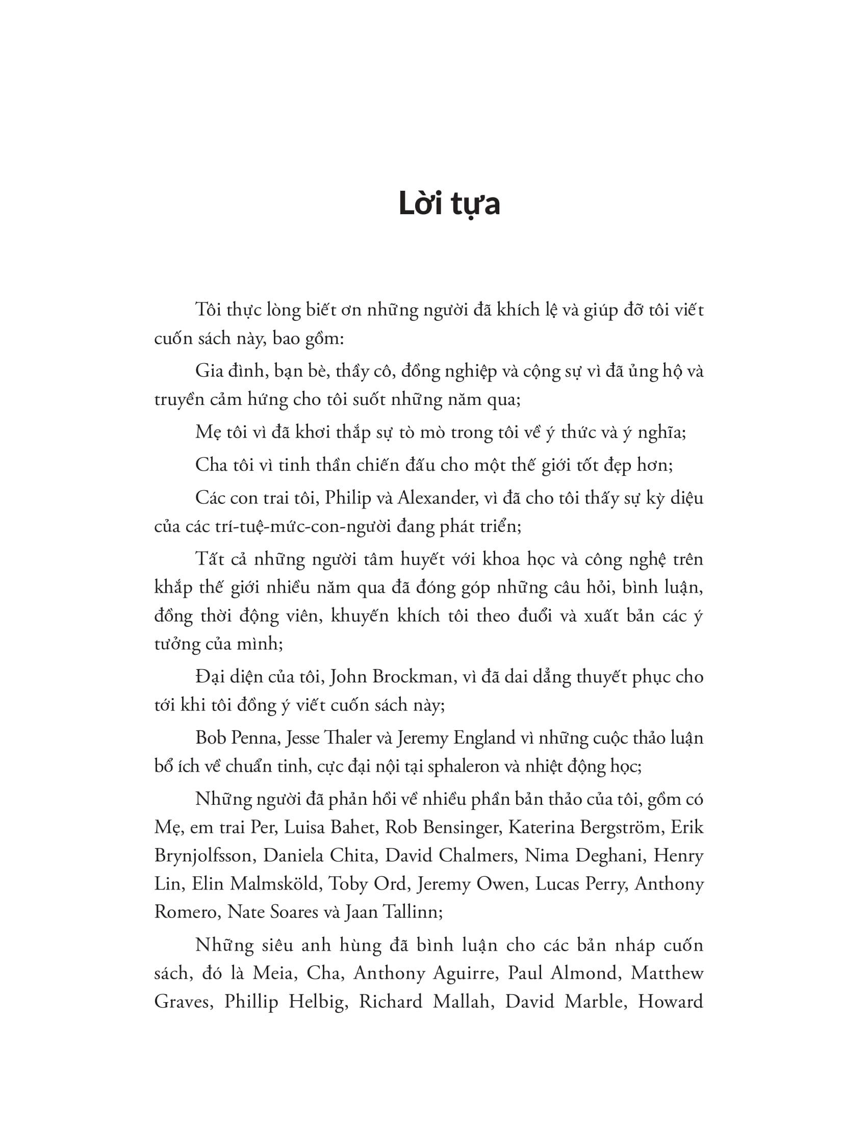 “Tất cả chúng ta – không chỉ các nhà khoa học, nhà tư bản công nghiệp hay nhà chiến lược – đều nên tự hỏi m.ình có thể làm gì để thu nhận tối đa ích lợi đồng thời tránh được các nguy cơ của AI trong tương lai. Đây là nội dung đối thoại quan trọng nhất của thời đại chúng ta, và cuốn sách đầy gợi mở này của Tegmark sẽ giúp bạn tham gia vào cuộc đối thoại đó.”