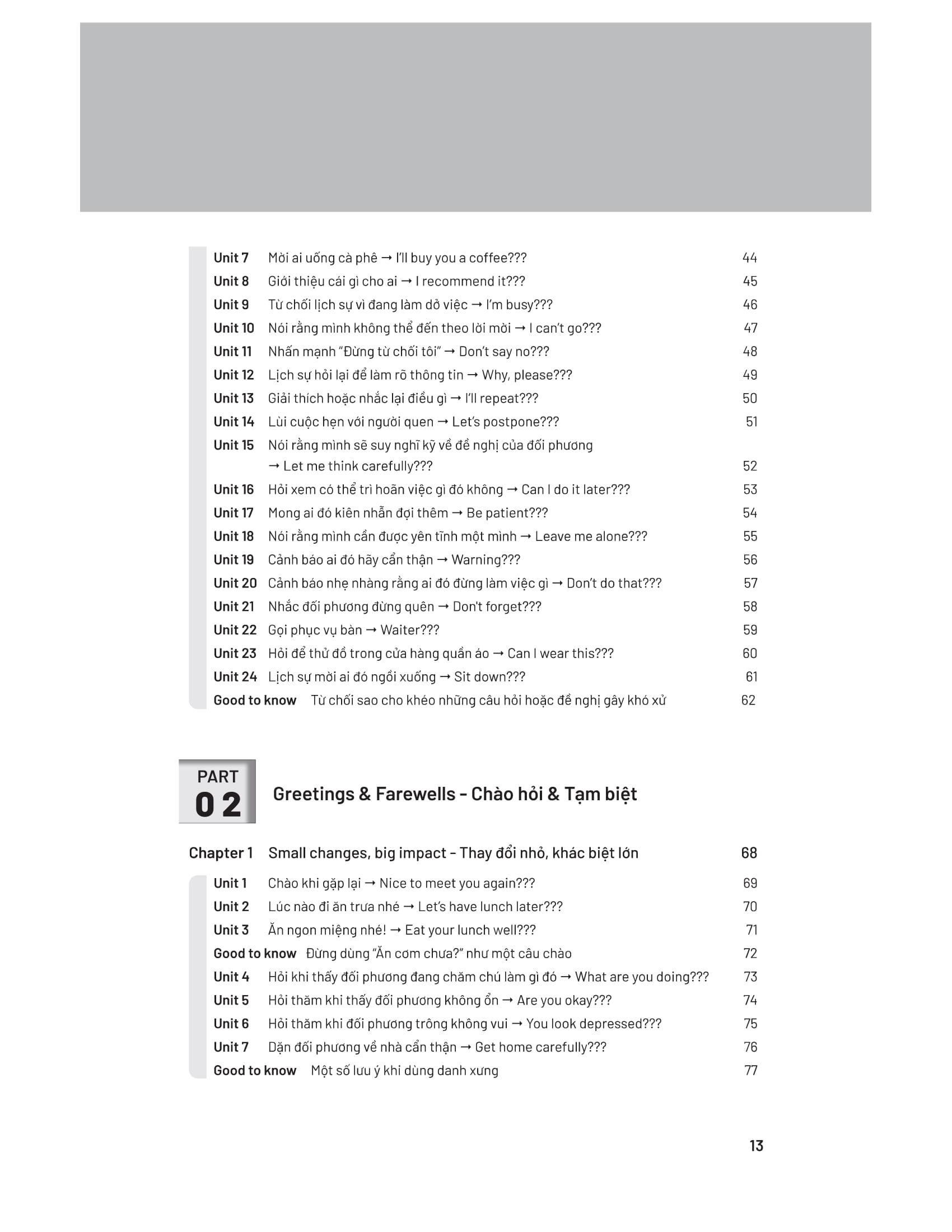Sách được chia thành 5 phần lớn theo các chủ đề giao tiếp phổ biến, mỗi phần sẽ bao gồm các bài học liên quan đến những tình huống giao tiếp quen thuộc trong đời sống, chỉ ra các cách diễn đạt sai hoặc không sai nhưng chưa khéo, đồng thời giới thiệu cách diễn đạt thay thế phù hợp trong tình huống đó. Ngoài ra, bạn cũng sẽ biết cách sử dụng ngôn ngữ tự nhiên hơn thông qua các câu ví dụ và đoạn hội thoại gần gũi; file audio đi kèm sẽ giúp bạn cải thiện cả kỹ năng nghe-nói.