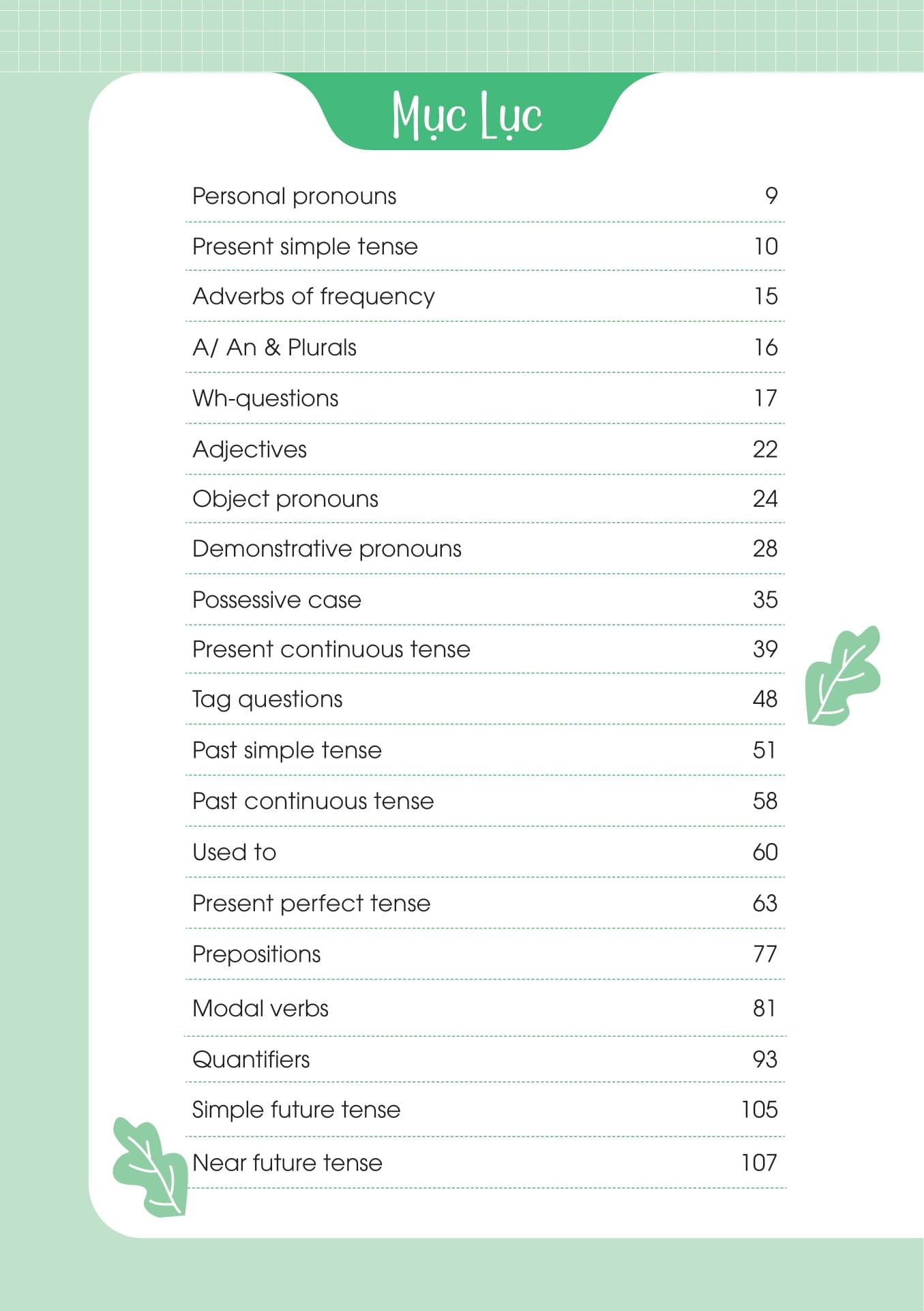 Mastering English Grammar - 180 Ngày Làm Chủ Ngữ Pháp Tiếng Anh Cuốn sách Mastering English Grammar – 180 Ngày Làm Chủ Ngữ Pháp Tiếng Anh mang lại nhiều lợi ích thiết thực cho người học: Xây dựng nền tảng ngữ pháp vững chắc: Bạn sẽ nắm vững các chủ điểm ngữ pháp từ cơ bản đến nâng cao, giúp tự tin hơn khi giao tiếp và viết tiếng Anh. Học tập đều đặn và hiệu quả: Với lộ trình 180 ngày, bạn sẽ dần dần xây dựng kiến thức ngữ pháp mà không cảm thấy quá tải. Ứng dụng kiến thức vào thực tế: Cuốn sách có phần luyện tập giúp bạn ôn tập và củng cố kiến thức, đồng thời tăng khả năng phản xạ khi sử dụng ngữ pháp trong giao tiếp. Phát triển toàn diện kỹ năng tiếng Anh: Kết hợp với từ vựng và hội thoại trong bộ Mastering English, bạn sẽ có một phương pháp học tiếng Anh toàn diện và logic.