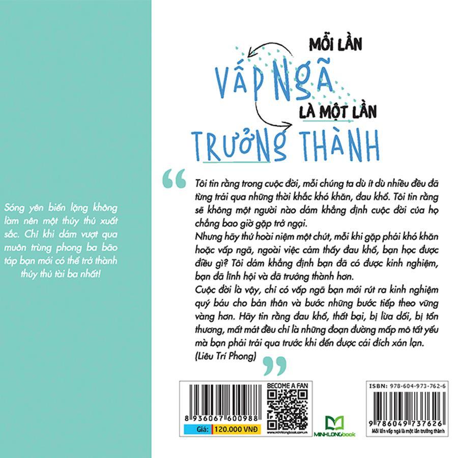 Mua tại TiktokSÁCH: MỖI LẦN VẤP NGÃ LÀ MỘT LẦN TRƯỞNG THÀNH NXB: NXB Thanh Niên Kích thước : 14.5 x 20.5 cm Năm xuất bản : 2019 Số trang : 376 Khối lượng : 430 grams Bìa : Mềm - tay gập Mỗi Lần Vấp Ngã Là Một Lần Trưởng Thành Vấp ngã và thất bại là chuyện thường tình trong cuộc sống Cuộc đời mà bình yên như như mặt nước không gợn sóng chỉ có trong tưởng tượng mà thôi. Ai trong đời chẳng gặp những thử thách, khó khăn.
