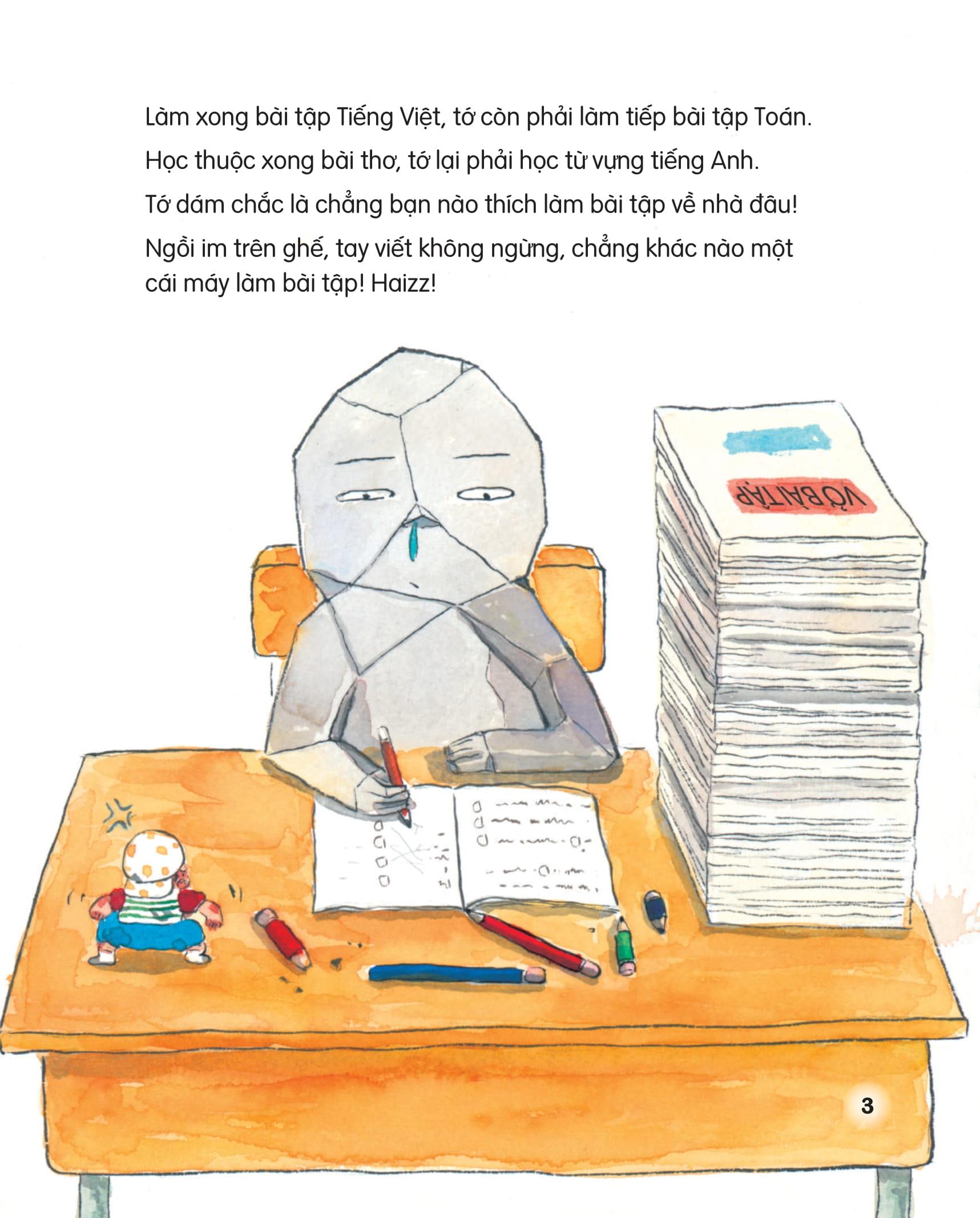 Cuốn Làm hết bài tập rồi mới chơi là câu chuyện của một bạn nhỏ luôn trì hoãn việc hoàn thành bài tập về nhà bằng những việc yêu thích khác như ăn vặt, xem ti vi, lắp lego, chơi phi thuyền... Và khi cậu bắt đầu ngồi vào bàn học thì đã quá muộn, cậu làm bài qua quýt cho xong. Chiếc máy làm bài tập xuất hiện. Bạn nhỏ giao hết mọi nhiệm vụ cho nó. Nhưng không ngờ chiếc máy làm bài tập đó cũng là một cao thủ trì hoãn và trong phút chót, nó cũng “ngấu nghiến” làm bài cho xong. Cuối cùng, bạn nhỏ vẫn bị thầy phê bình và tự rút ra được bài học đáng nhớ về tinh thần kỉ luật bản thân, tự hoàn thành bài tập trước khi chơi.