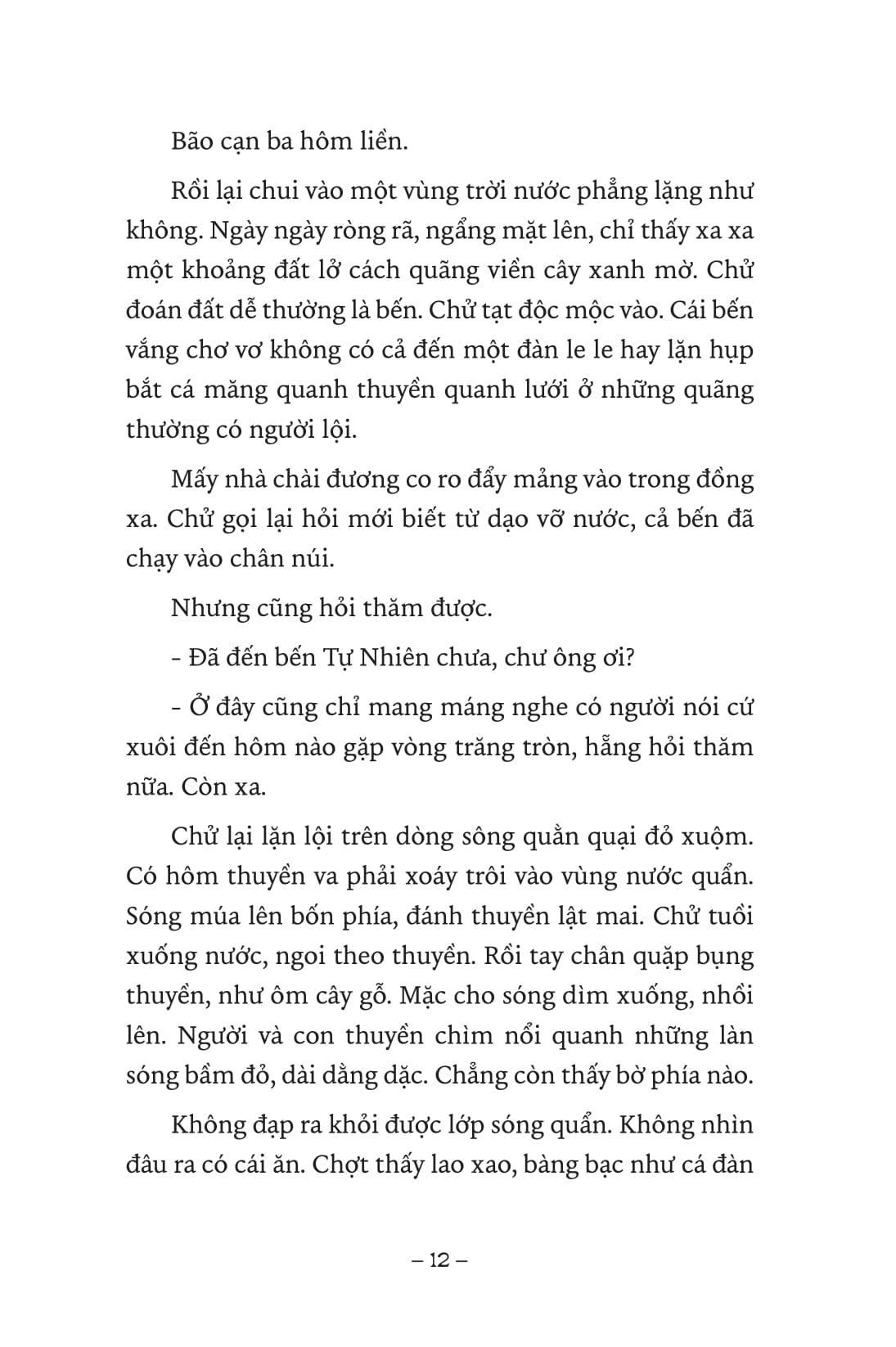 “Mai kia, trên cửa sông nhìn ra, nắng soi lên cát những bến bãi, chợ búa mọc như nấm. Thuyền bè ra vào phơi phới, nhiều không xiết kể. Hoa xoan tím ngát thơm say cả những người ngả gỗ ra làm. Đâu đâu rồi cũng kể về cuộc gặp gỡ lạ lùng của vợ chồng chàng Chử và câu chuyện làm nên sự tích này.”