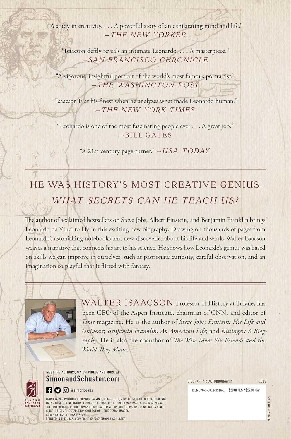 The #1 New York Times bestseller from Walter Isaacson brings Leonardo da Vinci to life in this exciting new biography that is “a study in creativity: how to define it, how to achieve it…Most important, it is a
