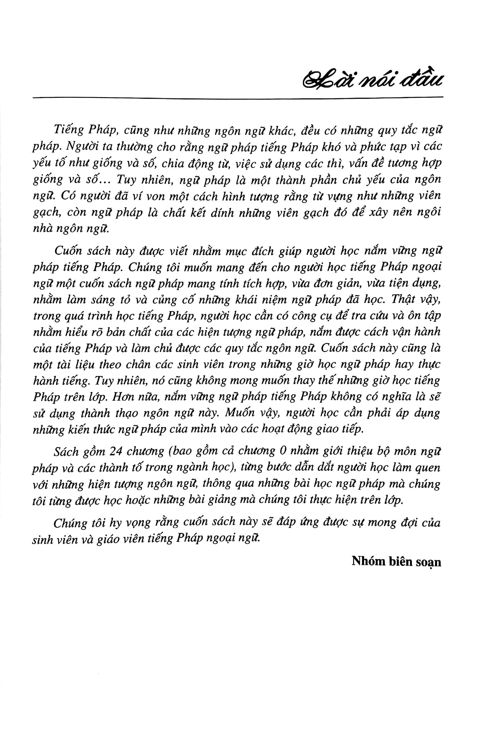 Ngữ Pháp Tiếng Pháp Căn Bản Sách gồm 24 chương, từng bước dẫn dắt người học làm quen với những hiện tương ngôn ngữ, thông qua những bài học ngữ pháp mà chúng tôi từng