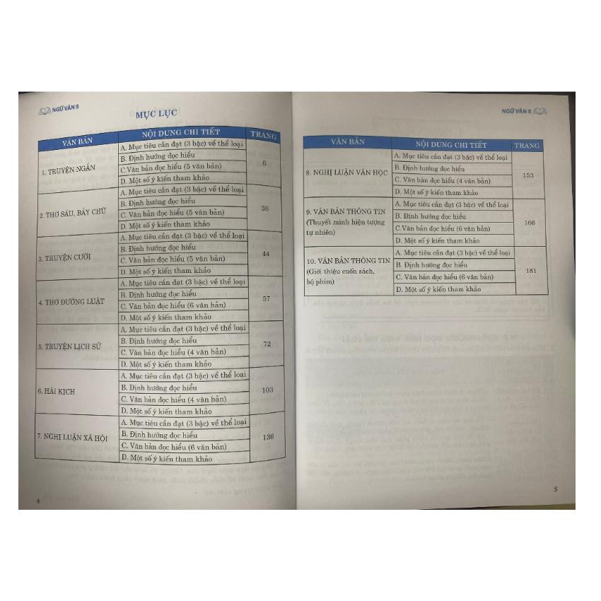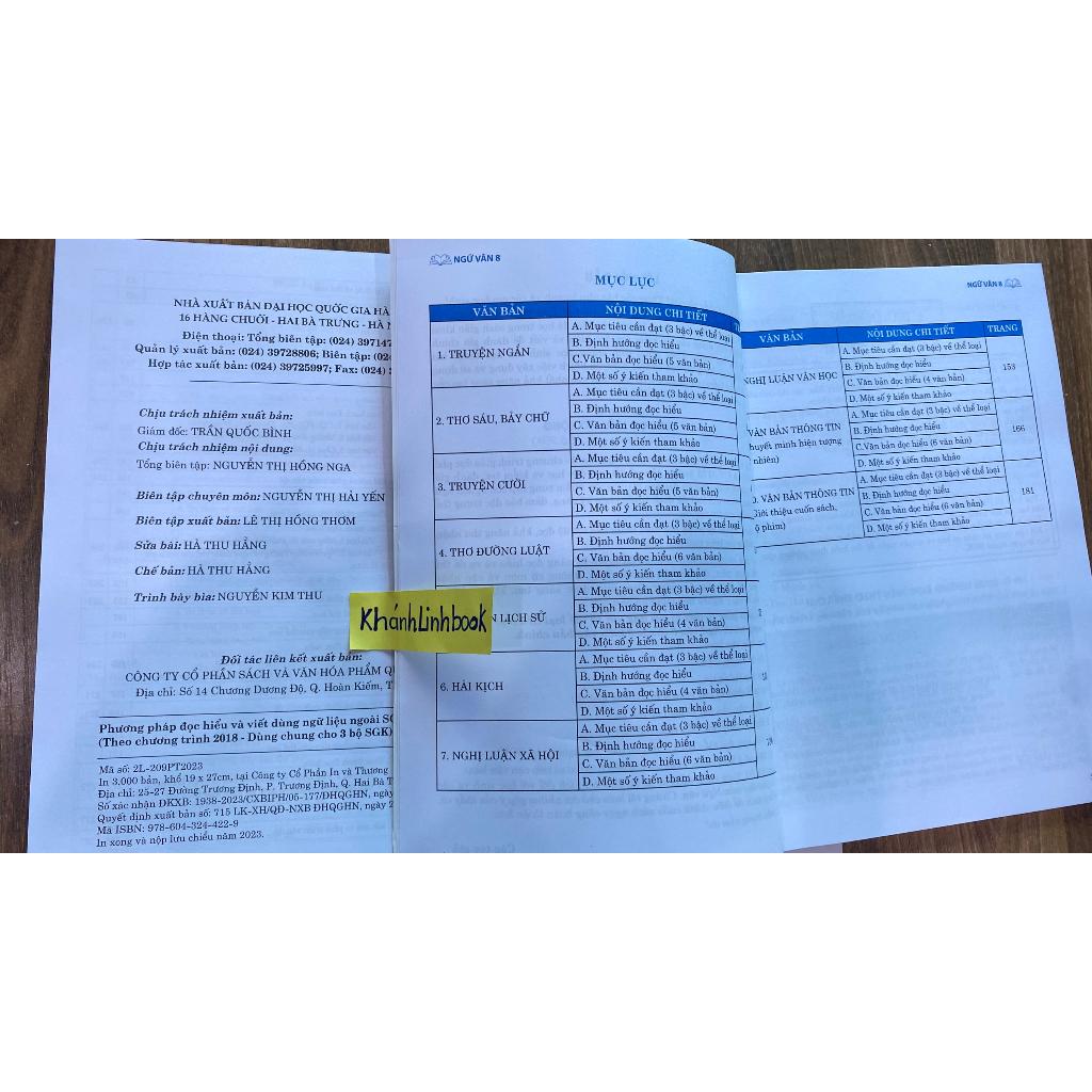 • Học sinh luyện kỹ năng đọc hiểu (đảm bảo tốc độ đọc, khả năng thu nhận và xử lý thông tin trên ngữ liệu mới).  - Giáo viên có nguồn ngữ liệu mở để luyện kĩ năng đọc hiểu và ra đề thi hướng tới mục tiêu, đề thi: câu hỏi đa dạng, không cũ mòn và cập nhật những vấn đề mới của đời sống; Giáo viên được sáng tạo, khám phá từ những vỉa tầng, ý nghĩa mới của văn bản mớ  Cuốn sách gồm 10 đơn vị bài ứng với 10 thể loại/tiểu loại (đọc hiểu) của chương trình Ngữ văn 8 thuộc 3 kiểu văn bản chính.  Văn bản văn học.  Văn bản nghị luận.  Văn bản thông tin.  Trong mỗi đơn vị bài gồm 4 nội dung chính:  A. Mục tiêu cần đạt (3 bậc) về thể loại.  B. Định hướng đọc hiểu theo thể loại.  C. Văn bản đọc hiểu (từ 4 – 10 văn bản mới ngoài 3 bộ SGK).  D. Một số ý kiến tham khảo về văn bản (làm cơ sở tiếp cận văn bản). Chúng tôi hy vọng cuốn sách sẽ là tài liệu hữu ích đối với học sinh và các thầy, cô giáo dạy môn Ngữ văn. Chúng tôi luôn chờ đợi những góp ý của thầy cô, các em học sinh để điều chỉnh cuốn sách ngày càng hoàn thiện hơn.